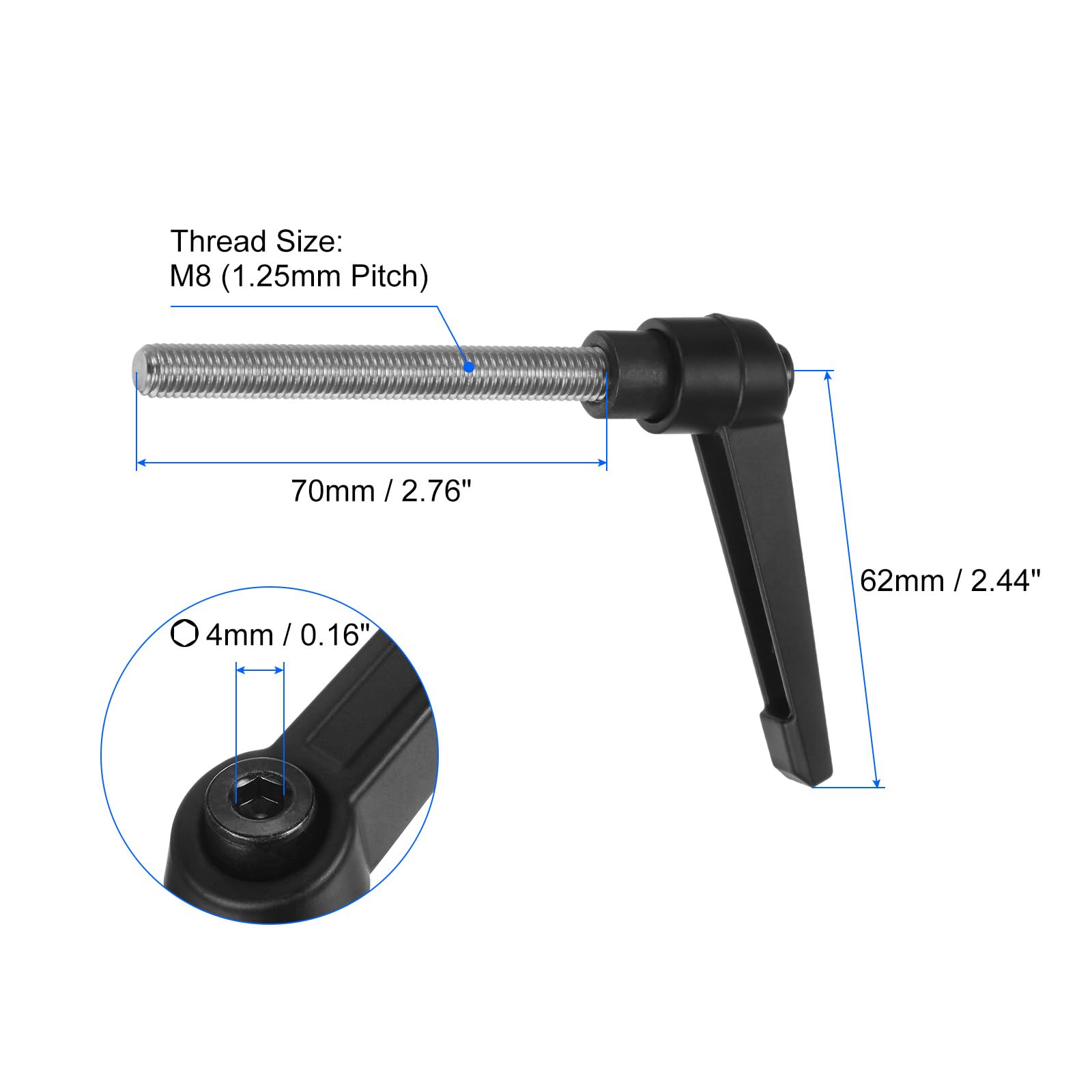 Serrez fermement le bouton de serrage pour éviter tout mouvement. Taille du filetage : M8 (pas de 1,25 mm)Longueur du filetage : 20 mm / 0,79 poLongueur du levier : 62 mm / 2,44 poTaille de la douille hexagonale : 4 mm / 0,16 poMatériau de la tige filetée : acier inoxydable 304Matériau de la poignée : alliage de zincFinition : revêtement pulvériséCouleur : noir, ton argentéContenu de l'emballage : 4 poignées à levier de serrageDescriptions :Les poignées de serrage permettent un serrage réglable, une installation facile et une prise confortable. Levier de serrage La poignée à levier est dotée d'un mécanisme de déverrouillage rapide pour un montage et un démontage rapides, et un mécanisme de verrouillage empêche tout glissement ou desserrage, offrant une prise sûre. La poignée à levier de serrage peut être tournée à 360 degrés en douceur et de manière ordonnée, ce qui facilite le travail dans les espaces restreints. Serrez fermement le bouton de serrage, et une force de serrage excessive peut endommager ou déformer les filetages. Il suffit de soulever la poignée des leviers à bouton-poussoir à cliquet pour libérer les dents de l'engrenage et les faire tourner librement pour un réglage rapide. 4PCS Poignées De Serrage Réglables M8, Poignée De Levier De Serrage Rapide En Acier Avec 20mm Goujon 89923712 Taille de la poignée à levier : Taille du filetage : M8 (pas de 1,25 mm) ; longueur du filetage : 20 mm / 0,79 po ; longueur du levier : 62 mm / 2,44 po ; taille de la douille hexagonale : 4 mm / 0,16 po ; finition : revêtement pulvérisé ; couleur principale : noir. Facilité d'utilisation : Il suffit de soulever la poignée des leviers à bouton-poussoir à cliquet pour libérer les dents de l'engrenage et les faire tourner librement pour un réglage rapide. Astuce : assurez-vous que le bouton de la poignée est de la bonne taille pour s'adapter au composant. QUARKZMAN 4 Pcs Poignées à Levier De Serrage, M8 X 70mm, Tige Filetée En Acier Inoxydable 304, Poignées Réglables à Verrouillage Rapide, Boutons De Boulon à Poussoir à Cliquet, Noir QUARKZMAN 4 Pcs Poignées à Levier de Serrage, M8 X 70mm, Tige Filetée En Acier Inoxydable 304, Poignées Réglables à Verrouillage Rapide, Boutons de Boulon à... Une force de serrage excessive peut endommager ou déformer les filetages. Les poignées à levier de serrage sont largement utilisées dans les applications de machines pour fixer ou serrer des composants en place, tels que les machines industrielles (fraiseuses, perceuses, tours), les équipements de menuiserie (scies, routeurs, raboteuses).