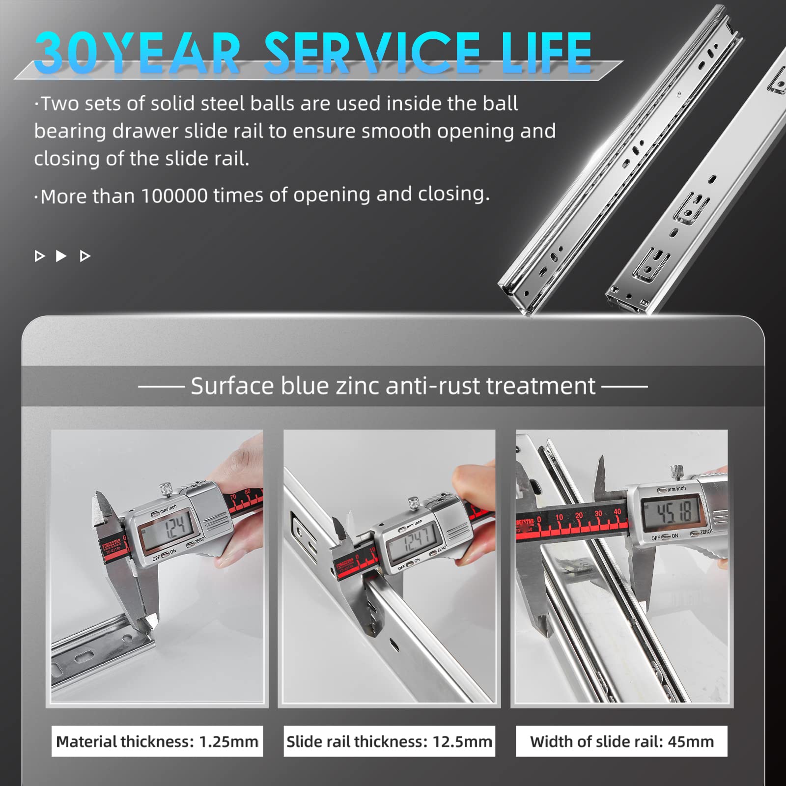 Caractéristiques : Couleur : blanc. Épaisseur du matériau : 1,5 x 1,5 x 1,5 mm., Hauteur : 50,5 mm., Largeur : 12,7 mm. Avec une double bille de roulement de qualité industrielle à l'intérieur, les tiroirs glissent facilement même si vous transportez des articles lourds. Lot de 4 paires de glissières de tiroir de 35,6 cm (8 pièces Glissière de tiroir lourde VAGUDE Caractéristiques techniques : 1., Version très robuste - Chaque paire peut supporter jusqu'à 68 kg 2., Matériau : métal galvanisé brillant., 3., Les glissières de tiroir avec boules permettent une ouverture et une fermeture fluides et silencieuses., 4., Glissières de tiroir lourdes à trois sections entièrement étendues, telles que les glissières utilisées pour les tiroirs lourds dans l'industrie des machines. L'espace entre le tiroir et le mur de l'armoire doit être de 1,3 cm chacun à gauche et à droite, total 2,5 cm (largeur intérieure du tiroir – largeur extérieure du tiroir = 2,5 cm). BAIDICE 1 paire de glissières de tiroir résistantes de 30,5 à 101,6 c... 【 Travail antirouille et lisse 】 La capacité antirouille et la résistance à l'oxydation de nos glissières sont supérieures aux autres en raison du traitement de surface spécial en zinc bleu galvanisé. Extension complète à 3 plis : largeur des glissières : 50 mm - Longueur : 350 mm - Longueur entièrement étendue : 700 mm, « L'extension complète en 3 parties » permet aux glissières de s'étendre complètement, de sorte que le tiroir peut être retiré complètement, ce qui permet d'accéder facilement à l'ensemble du rangement du tiroir. Remarque d'installation : convient pour les tiroirs de 35,6 à 40,6 cm. Amovible : il y a une boucle en plastique à l'arrière du rail de glissière, en appuyant dessus, la 3ème piste (la section la plus étroite) peut être séparée, ce qui signifie que le tiroir peut être installé et détaché facilement selon votre volonté. Modèle. 4605S2.550-6 ; Matériau principal. acier au carbone ; Charge portante. 100 lb / 45,4 kg ; Convient aux tiroirs d'une longueur de 22 pouces / 558,8 mm Glissières De Tiroir Résistantes – Extension Complète Remarque : les supports de montage et les vis ne sont pas inclus.