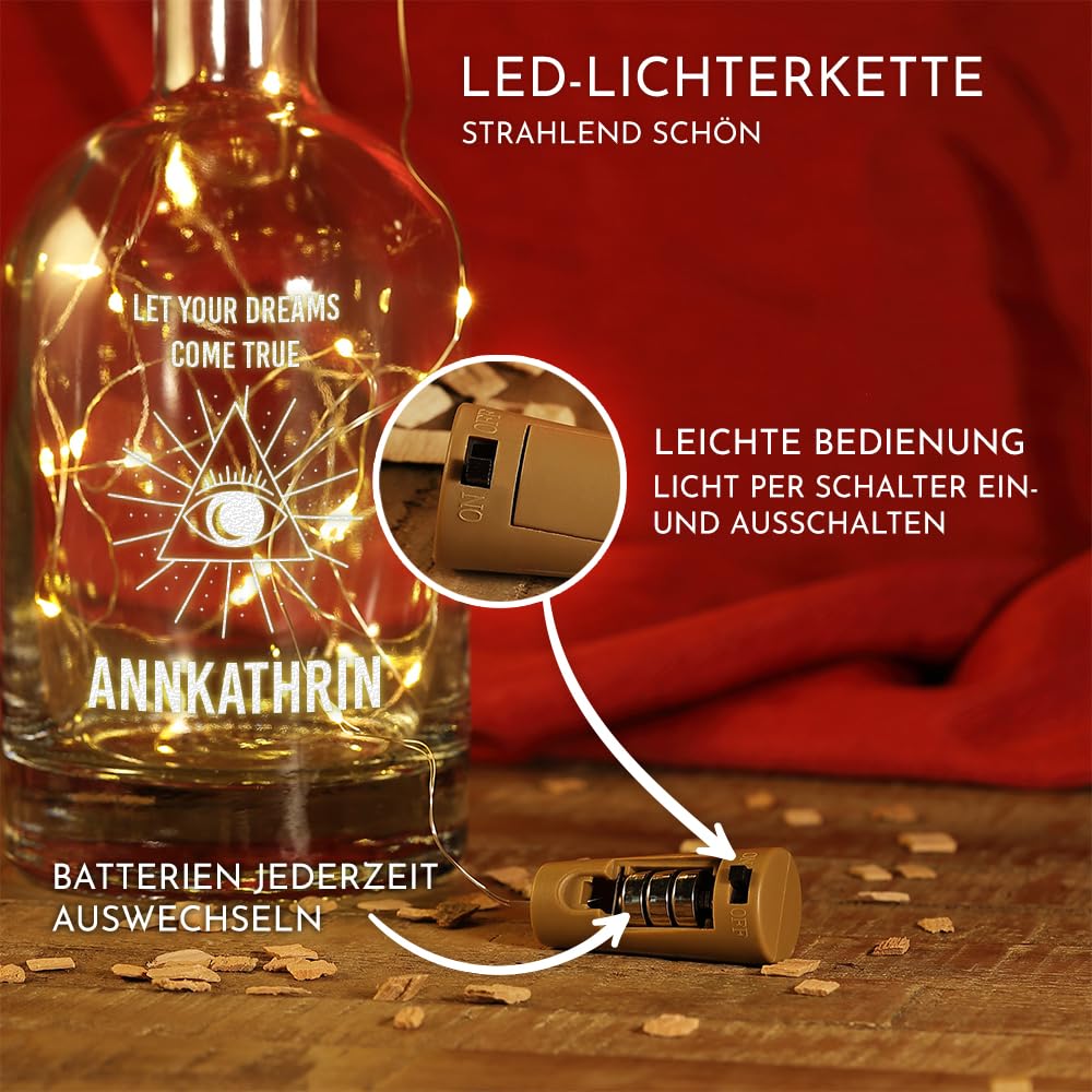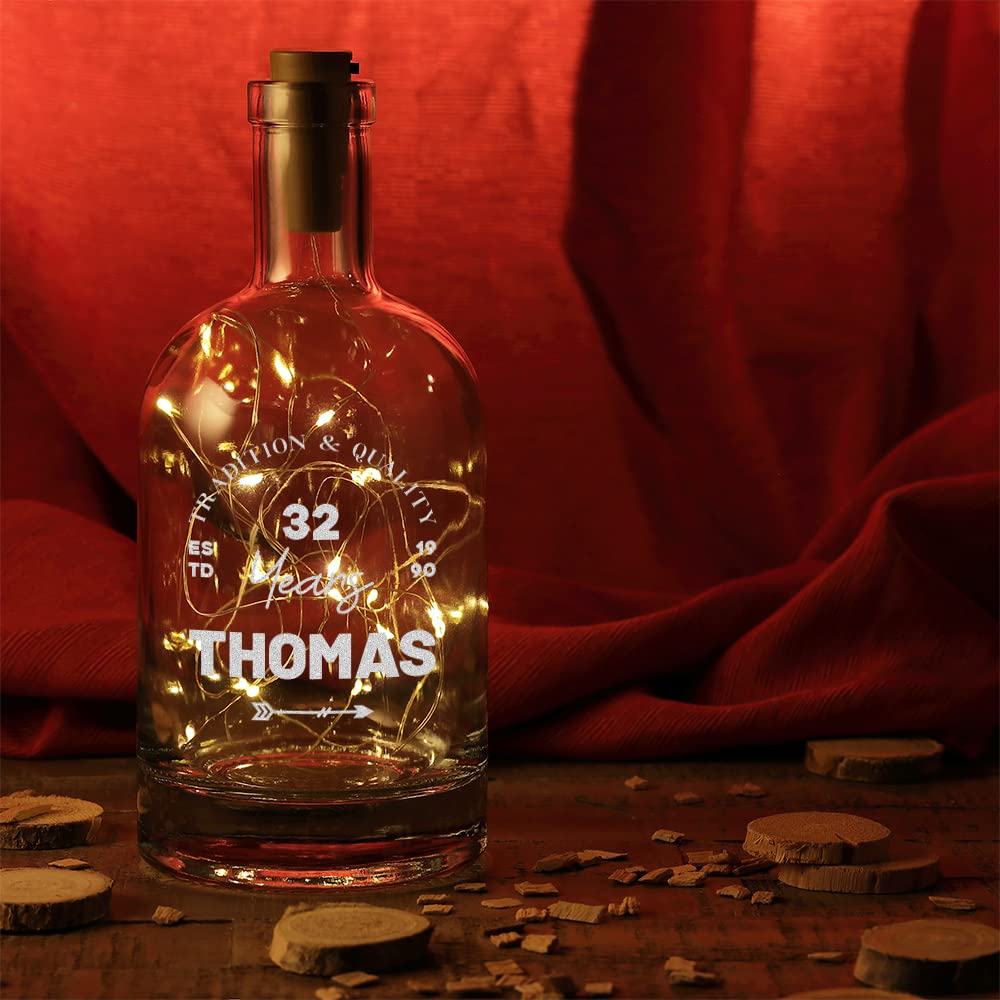 Un point fort est la gravure personnalisée, qui peut être déterminée par vous. Gravure au laser : la bouteille lumineuse LED peut être embellie avec une gravure personnalisée. Bouteille Lumineuse Avec Gravure Personnalisée - Avec Guirlande Choisissez l'un de nos motifs et ajoutez votre nom Notre bouteille lumineuse avec guirlande lumineuse LED est idéale comme accessoire décoratif pour votre maison pour créer une ambiance romantique. Choisissez l'un de nos motifs et indiquez-nous la gravure de votre choix. Le design de la bouteille combiné à la guirlande lumineuse LED moderne convainc par son design intemporel et élégant. Idée cadeau DIY : soyez créatif et décorez la bouteille lumineuse LED à l'intérieur selon vos propres souhaits. Grâce à un interrupteur, vous pouvez facilement allumer et éteindre la guirlande LED. Choisissez l'un de nos motifs et ajoutez votre nom, Id e cadeau DIY soyez cr atif et d corez la bouteille lumineuse LED l'int rieur selon vos propres souhaits. Très efficace et lumineux Télécharger Bouteille décorative ornée avec bougie lumineuse PNGs En... La guirlande lumineuse LED incluse est camouflée en liège et offre ainsi une finition appropriée à la bouteille. Créez une atmosphère unique dans votre maison. Caractéristiques du produit : 1 bouteille en verre (H 21,5 cm D : 9,3 cm) - Poids : 800 g - Finition : gravure laser - 1 guirlande lumineuse LED Un excellent cadeau pour un anniversaire, un départ, un jubilé, la fête des mères, la fête des pères, un anniversaire de mariage ou comme cadeau pour les occasions spéciales. Bouteille de champagne et verre avec guirlande lumineuse isolée sur