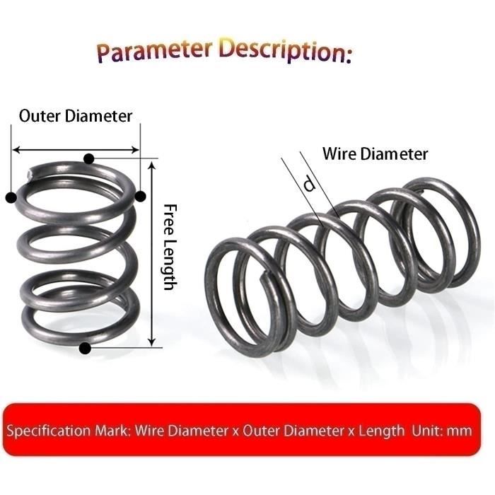 Haute élasticité et bonne précision, petite taille installée et génère une force forte. Colonne de gabion ronde, diamètre 42 cm, maille 5 x 5 cm - Hauteur : 230 cm - Diamètre du fil 4... Tronconneuse Pour Pieces 25MMX18MMX180MM RESSORTS TENSION En Acier Au Manganèse 2Pcs Noir Compresseur De Ressort Amortisseur Utilisation générale des jouets à ressort, des outils, etc. Ressorts De Compression Mécaniques MroMax Ressort Comprimé Allongé Diamètre 0,1 Cm, OD 0,6 Cm, Longueur Libre 2 ,5 Cm, Ressort De Tension En Acier Inoxydable 15 Pièces Ressort De Compression Gutekunst Ressorts - Votre spécialiste pour les ressorts de compression, de traction, de torsion et les pièces cambrées de fil. Plus de 10.000 tailles de ressorts différents disponibles de suite. Ressorts individuels jusqu'à un diamètre de fil de 12,00 mm en petites quantités ou en grandes séries Ils absorbent l'énergie d'une force agissant sur eux en devenant plus court, stockent cette énergie tout en étant compacte, et s'étendent au fur et à mesure qu'ils libèrent l'énergie. Diamètre du fil : 0,3 mm ; diamètre extérieur : 3 mm ; longueur libre : 20 mm.