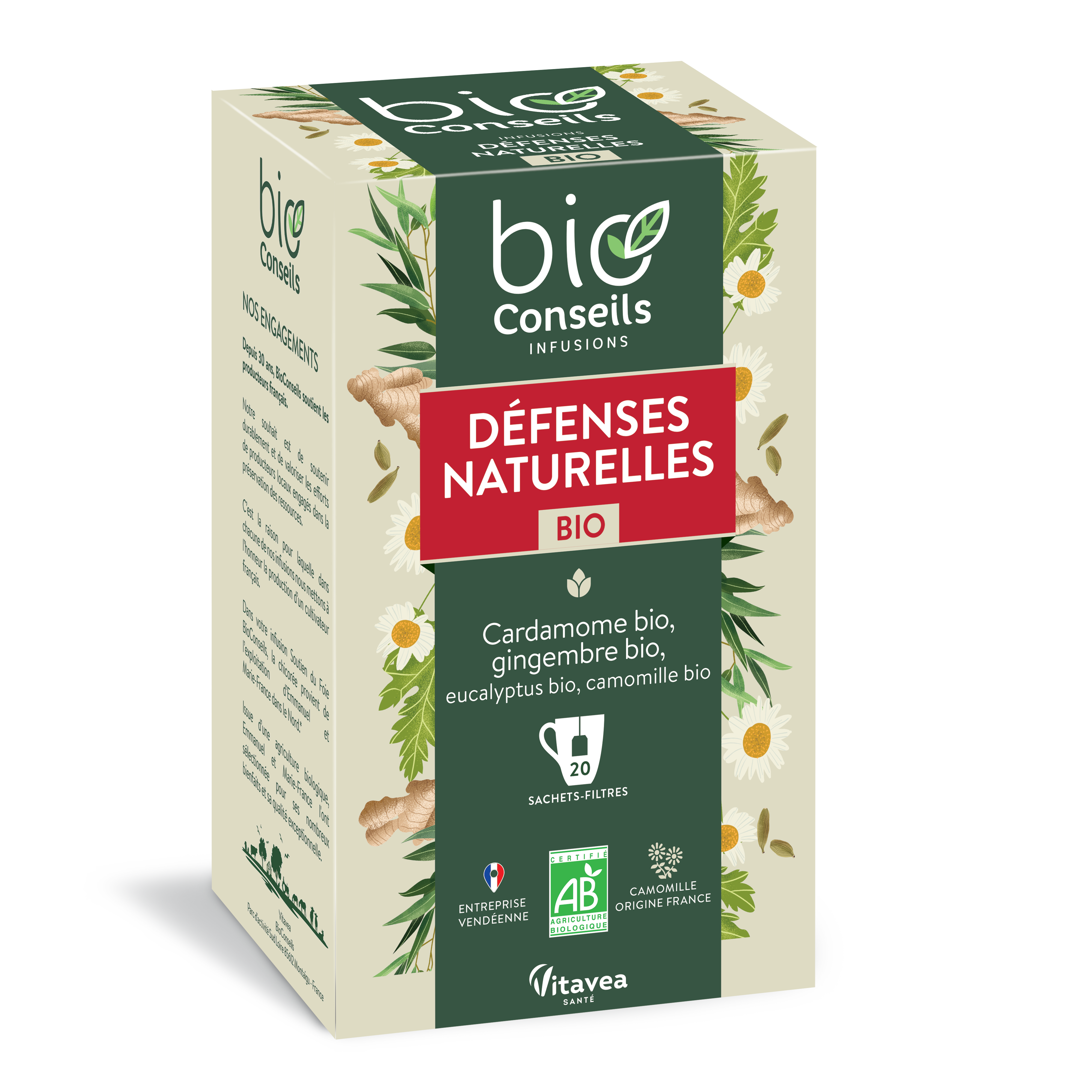 Boire 2 à 3 tasses par jour matin, midi et soir. Nature & Santé - parc d'activité sud Loire 85612 Montaigu France Ingrédients Eucalyptus (Eucalyptus globulus) ; cardamom (Elettaria cardamomum) ; german chamomile (Matricaria recutita) ; ginger (Zingiber officinale). Directions: 1 à 3 tasses par jour. Infusion défenses naturelles BIO apporte une aide pour soutenir les défenses naturelles. Lorsque l'organisme est fragilisé, la cardamome s'allie au gingembre pour favoriser la résistance de l'organisme. Ils participent à l'entretien des défenses naturelles tout au long de l'année. L' eucalyptus et la camomille complètent la formule. BioConseils propose des infusions bienfaisantes et... Le thé vert, gingembre et sureau qui possèdent des propriétés antioxydants s'allient pour fortifier l'organisme., Sans gluten. To be consumed as part of a varied and balanced diet. Infusion Défenses naturelles Bio 20 sachets-filtres Bioconseil de Bioconseil est vendu sur la boutique Le coin des écolos dans la catégorie Infusions conseillé de renforcer les défenses naturelles et contribuer à une bonne résistance de l'organisme cette infusion est une combinaison de 5 plantes biologiques: aubier de citron vert, cardamome, gingembre, sureau et thé Avertissement De Sûreté Not recommended for children. Infusion Éveil tonique Bio - bioConseils - Infusions | Laboratoires Thé Vert Menthe Nutrisanté Infusion Bio Défenses Naturelles 20 Pc(s) - Redcare Pharmacie Ventre Plat Bio cette infusion est une combinaison de 5 plantes biologiques: aubier de citron vert, cardamome, gingembre, sureau et thé · conseillé de renforcer les défenses... Il n est pas conseillé de dépasser la dose recommandée.