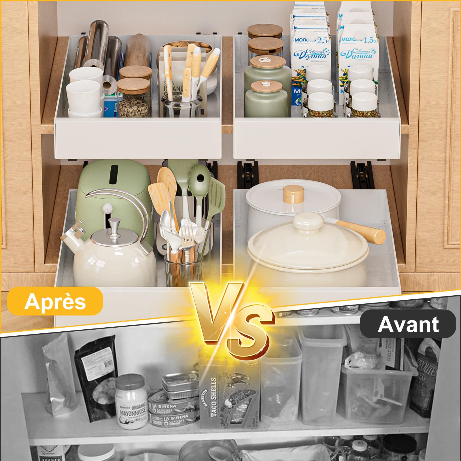Largeur extensible : cet organiseur coulissant ajoute la possibilité de régler la largeur. Robuste et robuste : nos organiseurs coulissants sont fabriqués en acier inoxydable. Il est très pratique pour ranger et organiser votre étagère à épices, casseroles, poêles, tous les ustensiles de cuisine et fournitures de nettoyage. Lot de 2 organiseurs coulissants pour armoires, tiroirs Boîtes Rangement FrigoLot de 2 boîtes de rangement extensibles pour... KIKIBRO Lot De 2 Organiseurs De Tiroir Coulissants Extensibles 【Glissière fluide】 Cette étagère coulissante pour armoire de cuisine est fabriquée avec un système de roulement à billes de sorte que le glissement est très fluide. Votre satisfaction est notre objectif. Installation facile : le tiroir coulissant est monté sur le côté. Il peut même être utilisé comme séparateur de garde-robe pour ranger les armoires en désordre. Nous vous répondrons dans les 24 heures.