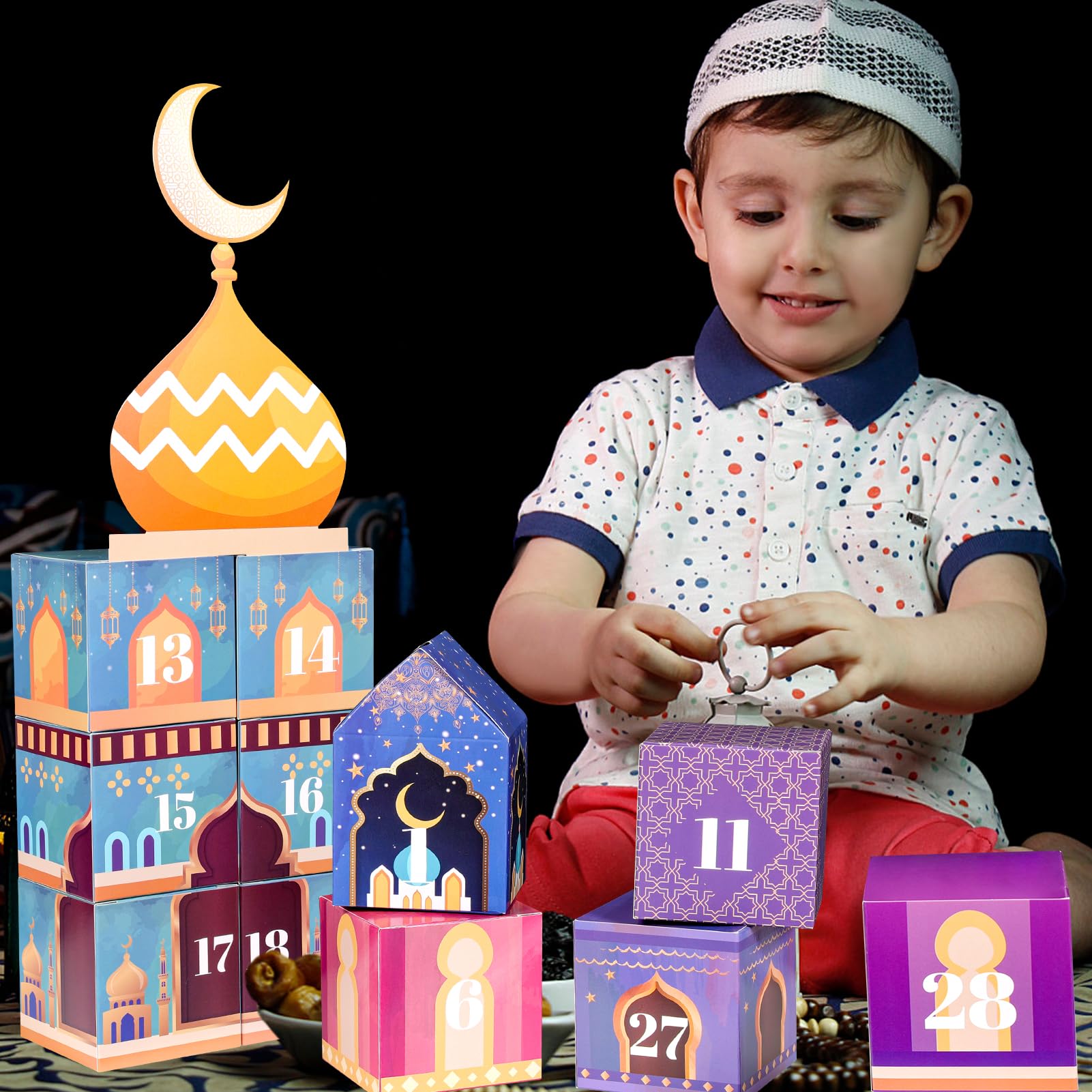 Les boîtes décorées peuvent être remplies de petits cadeaux ou de bonbons pour résister à la fête du sucre. Notre lot contient 30 boîtes cadeaux et 30 autocollants avec les chiffres de 1 à 30., Chaque coffret cadeau est différent : cinq designs différents et cinq tailles différentes, magnifiquement imprimés avec une feuille d'or brillante. Augmentez le plaisir du calendrier Ramadan DIY pour les enfants. Calendrier de l'Avent Ramadan avec tiroirs, 30 boîtes vides C'est le cadeau parfait pour les enfants et les adultes. Chacun des 4 côtés de la boîte est imprimé avec un motif différent, par exemple par exemple avec des étoiles, un style d'écriture, une lune et des motifs de château, ce qui crée une atmosphère festive pour le mois traditionnel du Ramadan. J'ai trouvé sur Amazon ces autocollants numérotés ainsi que ces petites pochettes vendues par trente. ... pour pouvoir ouvrir un de ses cadeaux... Facile à utiliser : le calendrier de l'Avent Ramadan à remplir et les autocollants sont séparés, vous pouvez les plier et les installer rapidement, sans ciseaux, colle et autres outils, économisez du temps et des efforts. Réutilisables : les sacs cadeaux Ramadan sont faciles à plier et à réutiliser l'année prochaine. Un ajout joyeux au mois traditionnel du Ramadan. Laissez vos enfants et votre famille vivre une fête spéciale du sucre ! Calendrier de l'Avent à remplir, 26 sacs de calendrier de l'Avent en... Calendrier De L'avent Ramadan DPKOW Calendrier De L'Avent Ramadan Rechargeable à Remplir Soi-même Avec 30 Poches, Noir Et Doré Calendrier Ramadan Enfant Et le meilleur est que ces boîtes cadeaux sont faciles à plier et à réutiliser car elles peuvent être facilement pliées pour l'année prochaine.