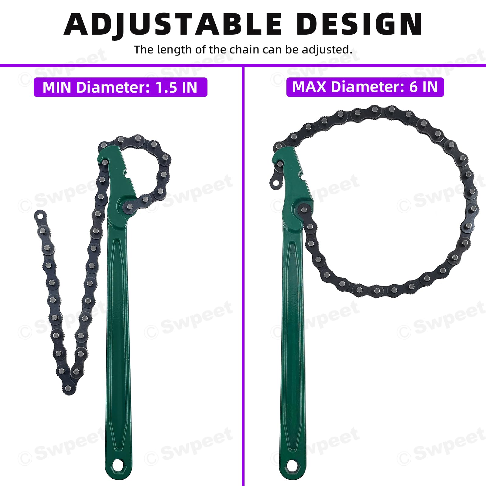 La surface de la poignée est lisse et sans bavure. VEVOR Support de Tronçonneuse 54,5x13 cm Fourreau Protecteur Scie à Chaîne Universel Acier SPCC... La clé à chaîne VEVOR offre une capacité de serrage de 7-1/2" avec une chaîne antirouille et antidérapante, une poignée ergonomique et une construction en acier robuste pour une utilisation polyvalente en plomberie. Matériau : acier au manganèse + acier à haute teneur en carbone. Il est conçu avec une double mâchoire dentelée, peut pivoter dans deux directions pour faciliter l'angle de fonctionnement. Il est pulvérisé et galvanisé, résistant à l'usure. Antidérapant : la chaîne de clé a des dents fines, se fixe fermement, mord fortement, ne glisse pas facilement, et permet d'économiser plus d'efforts. Diamètre du filtre applicable : 60-150 mm. Conçu pour fournir une force de verrouillage maximale. Caractéristiques : Couleur : argenté. Jeemiter Clé à Chaîne à Cliquet Robuste, 30,5 Cm, Clé à Chaîne De Filtre à Huile Automobile Pour Filtre à Carburant De 3,8 Cm à 15,2 Cm De Diamètre Ergonomique et robuste, elle est fabriquée en acier à haute teneur en carbone et en fonte. Sa chaîne réglable s'adapte à la plupart des filtres à huile... EJ.life Clé à chaîne de 12 pouces Clé à Chaîne Haute Dureté Surface