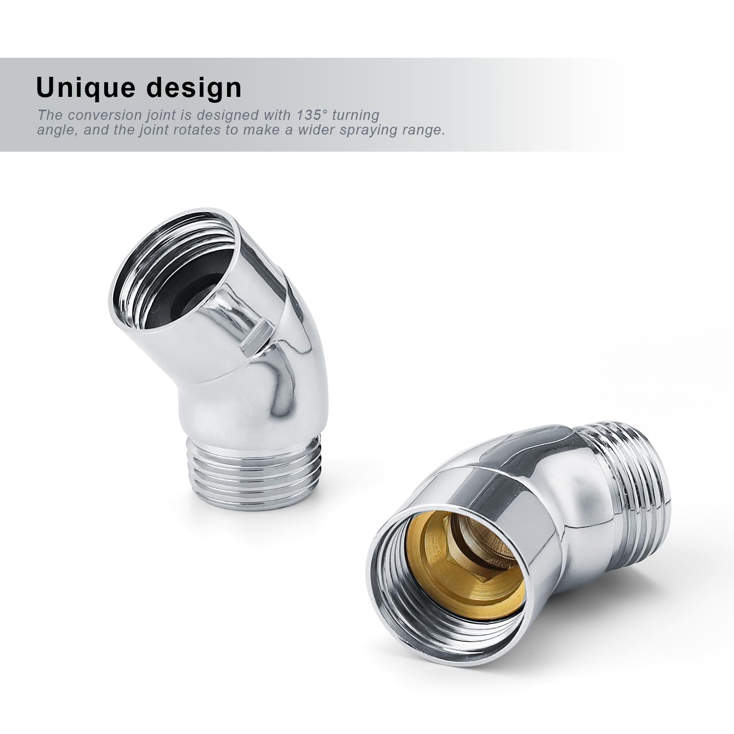 Spécification : Type de produit : coude pour pommeau de douche Dimensions du produit : 2 x 3,8 cm Matériau : laiton. Lot de 2 adaptateurs coudés pour pommeau de douche à 135 EN STOCK : Adaptateur de douchette à 135 °, adaptateur de tuyau de douche, pièce articulée, raccord coudé pour douchette, adaptateur de tête pivotante... Remarque : Les mesures étant prises à la main, les tailles indiquées peuvent varier légèrement. - Large gamme d'applications : adaptateur de douchette à main de nombreuses possibilités d'utilisation, compatible avec une variété d'accessoires de douche tels que les douches à main, les douches de tête, les baignoires de douche, etc. 2 joints d'étanchéité. - Installation facile : adaptateur de tuyau de douche équipé de filetages de douche à angle intérieur et extérieur G 1/2, il peut être installé facilement et sans autres outils, pratique et rapide, de sorte que vous pouvez en profiter rapidement. Les couleurs peuvent varier légèrement en raison des différents écrans. Caractéristiques du produit : - Bonne performance d'étanchéité : l'adaptateur de pommeau de douche dispose d'un design sans contrôle de l'eau et d'une pression illimitée et est équipé d'un joint d'étanchéité en caoutchouc pour éviter les fuites d'eau. et assurent une expérience de douche agréable et confortable. Tantôt de forme arrondie, tantôt de forme carrée, les caches pour douchettes rivalisent par leurs formes, leurs couleurs et leur qualité. Ces coudes de raccordement pour douche sont souvent fabriqués en matière plastique thermoformée (ABS) qui présente une résistance satisfaisante aux chocs et une légèreté sans équivoque Raccord Douche JANDH Lot De 2 Raccords Coudés Pour Pommeau De Douche 135°, Coude Pour Douchette, Angle Réglable Raccord Flexible Douche Haute qualité : la pièce coudée pour pommeau de douche est une pièce coudée en cuivre, résistante à la corrosion et imperméable.