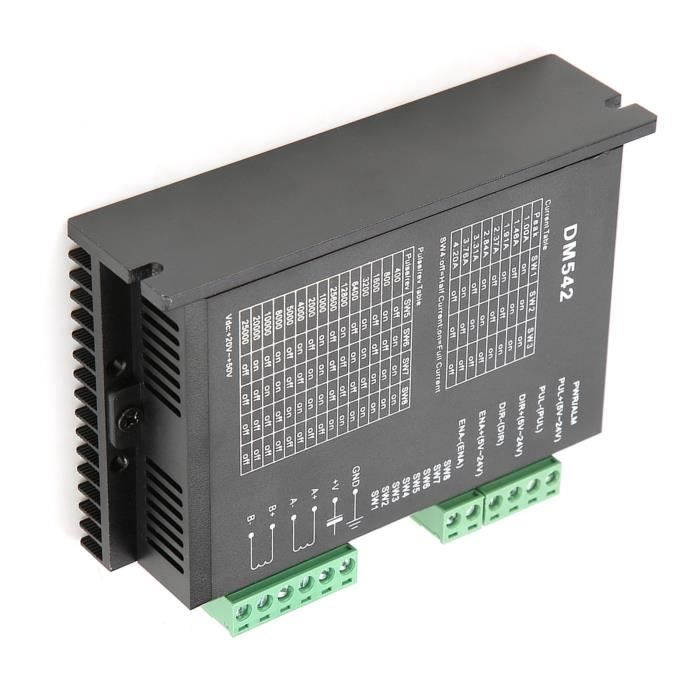 Fréquence de découpe : 20 kHz. Fréquence de découpe de 20 kHz. Courant d'entrée logique : 1 0-20 mA Température de fonctionnement : de -15 °C à +45 °C. Contrôleur De Moteur Pas à Pas Numérique DM542, 2 ... – Grandado dm542 numérique 2 phases 18-48 VDC max. Controlador 2DM542 4A para motor paso a paso bifásico CNC 57/60 VoborMX... Entrée de signal d'isolation optique Courant de sortie réglable Méthode de hachage à courant constant bipolaire Segmentation élevée : 2,4,8,16,32,64,128,256., 5, 10, 25, 50, 125, 200., Compatible avec le signal d'entrée TTL, tout en acceptant l'entrée de signal différentiel. Le lecteur utilise une structure de composant discrète qui prend en charge les 4 fils biphasés, 6 fils et 8 fils tant qu'il n'y a pas de surtension ni de câblage. Fréquence de découpe de 20 kHz. Entrée de signal d'isolation optique. Le courant de sortie DIP est réglable. 14,7 x 10 x 3,8 cm; 232 grammes. Non Entrée de signal d'isolation optique. Dimensions : 11,7 x 8,5 cm Contenu : 1 pilote de moteur pas à pas DM542 VBESTLIFE contrôleur de pilote moteur pas à pas DM542 de pas à pas