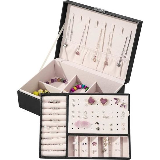 Boîte à bijoux pour femme, fille, épouse, design exquis en métal à 2 couches, organiseur de bijoux avec verrou pour boucles d'oreilles, collier, bague (violet) Design élégant et original : cette boîte à bijoux noire classique dispose d'un élégant design unique en métal, simple mais généreux. Idée cadeau parfaite : offrez cette boîte à bijoux au design original à vos proches pour leur anniversaire ou leur anniversaire de mariage pour les surprendre Ou offrez-vous cette boîte à bijoux fantaisie, vous le méritez ! Le couvercle est conçu pour verrouiller fermement tous les tiroirs et les armoires pour protéger vos bagues, boucles d'oreilles, colliers, bracelets, montres et... Le porte-bijoux de style floral est beau, qu'il soit affiché sur la commode de votre chambre ou votre vestiaire pour organiser vos épingles, colliers, bagues, bracelets et autres accessoires Design élégant et original : cette boîte à bijoux blanche classique dispose d'un élégant design unique en métal, simple mais généreux. Doublure en flanelle beige douce et délicate pour une ouverture et une fermeture magnétiques sans effort. Optimisez votre espace : gardez vos bijoux bien rangés et à portée de main avec notre boîte à bijoux. Caractéristiques pratiques : les planches de boucles d'oreilles peuvent être positionnées dans le plateau supérieur, la section inférieure ou à l'extérieur de la boîte pour fournir un rangement adaptable. Le porte-bijoux de style floral est beau, qu'il soit affiché sur la commode de votre chambre ou votre vestiaire pour organiser vos épingles, colliers, bagues, bracelets et autres accessoires Caractéristiques pratiques : les planches de boucles d'oreilles peuvent être positionnées dans le plateau supérieur, la section inférieure ou à l'extérieur de la boîte pour fournir un rangement adaptable. Tous ces éléments combinés rendent cette boîte à bijoux élégante et assez durable pour votre collection de bijoux en pleine croissance Boîte à Bijoux Noire pour Bagues | Bijoux Evasion Porte Bijoux Occasion Boîte à Bijoux 2 Niveaux En Cuir Imperméable Pour Bague Collier Bracelet Montre Commode à Bijoux Collier Pour Porte Bijoux Les cloisons amovibles créent de l'espace pour les articles plus grands, cet organisateur de bijoux offre une protection complète pour tous vos accessoires chéris, les protégeant de la poussière et des rayures