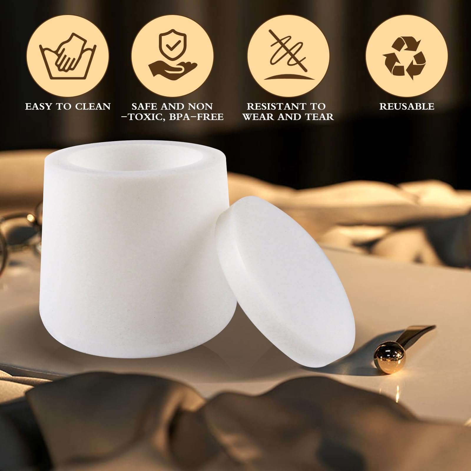 Artisanat créatif : ces moules en silicone pour bougeoirs offrent une créativité illimitée, permettant la création de bougeoirs uniques qui complètent tout décor. Ces moules offrent une durabilité, permettant la création de produits finis visuellement magnifiques avec des couleurs de résine, des paillettes, des fleurs séchées, de l'argile, et plus encore, assurant une utilité et une valeur durables. Avec deux tailles dans l'emballage – un moule plus grand et un plus petit – les deux bougeoirs ronds rayés, ils empêchent le débordement de cire et le basculement, assurant des produits finis propres et élégants. Bougies en Forme de Tasse]avec ce moule à bougies, vous pouvez facilement fabriquer des bougies, des vases et des pots pour ajouter une touche charmante à la... Ces moules en silicone sont parfaits pour créer tes propres candélabres en résine époxy ! Le lot comprend 2 tailles différentes : un grand (diamètre 8.5cm... Moule De Bougie Barre De Shampooing Ronde En Résine Silicone DIY Époxy Cadeaux Outil De Lotion Bougie Moule Bougie Silicone Abeille Partagez votre passion artisanale avec vos proches comme un charmant cadeau de bricolage pour un anniversaire, la Saint-Valentin, la fête des mères, un mariage, ou comme geste artistique pour les amateurs de résine artisanale. Moules Silicone Candélabres Résine Époxy - Lot De 2 Facile à utiliser et pratique à faire soi-même : conçus pour la simplicité, ces moules à bougies en silicone sont facilement démontés et démoulés tout en conservant leur forme. Matériau polyvalent et durable : fabriqué à partir de silicone doux, flexible et lavable, ces moules encouragent les projets de bricolage imaginatifs. Idéal pour offrir et décorer : ces moules en silicone sont non seulement adaptés pour les travaux manuels quotidiens, mais font également de merveilleux cadeaux pour Thanksgiving, Noël, anniversaires, pendaison de crémaillère, mariages, et plus encore.