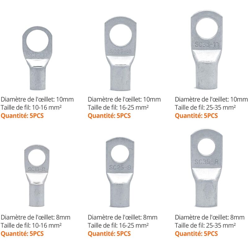 Les extrémités de câble en cuivre de haute qualité sont fabriquées en technologie de moulage sous pression, qui est robuste et durable. L'épaisseur de la paroi du tube des cosses de câble de haute qualité garantit une conductivité optimale et offre une protection stricte pour éviter la séparation du conducteur pendant les vibrations. Lot De 40 Cosses Tubulaires Awg2 Awg4 Awg6 Cosses À Anneau Cosses De... Les connecteurs de bornes de la série SC sont fabriqués en laiton de haute qualité avec une surface étamée, qui a une bonne conductivité et une longue durée de vie. Type d'isolation : Non isolé. Large application : les cosses de câble tubulaires sont largement utilisées dans divers types d'équipements électriques pour une connexion sûre, tels que : maisons, batteries, appareils ménagers, automobiles, industrie électrique, équipements mécaniques, etc. Le design visuel de la borne à anneau garantit la bonne insertion de la fils et assure l'efficacité du travail. ZJCHAO Bornes à anneau isolées 50pcs Cosses à Anneau Isolées Cet ensemble de cosses de câble comprend principalement SC16-8 (connecteur à sertir de 16 mm² et œillet à anneau M8) La profondeur du fil peut être directement observée, et le trou visuel de la pince de fil peut être utilisé pour voir s'il est inséré correctement, afin de l'ajuster à temps. Matériau de haute qualité : le jeu de cosses tubulaires est fabriqué en laiton de haute qualité avec une bonne conductivité, la surface est étamée, anti-corrosion et anti-oxydation, et a une longue durée de vie. Cosse A Sertir 16mm2 Lot De 20 Cosses De Câble M8, SC16-8 - Cosses Tubulaires Non Cosse M8 16mm2 EN STOCK : Lot de 80 cosses de câble électriques en cuivre étamé SC - Assortiment de connecteurs électriques pour cosses de câble - 6 mm², 10 mm², 16 mm²... Facile à identifier : le modèle et la taille sont marqués sur la surface de nos cosses de câble, ce qui facilite l'identification du modèle et pratique pour votre vie quotidienne. Méthode de câblage : Sertissage Couleur : Argenté
