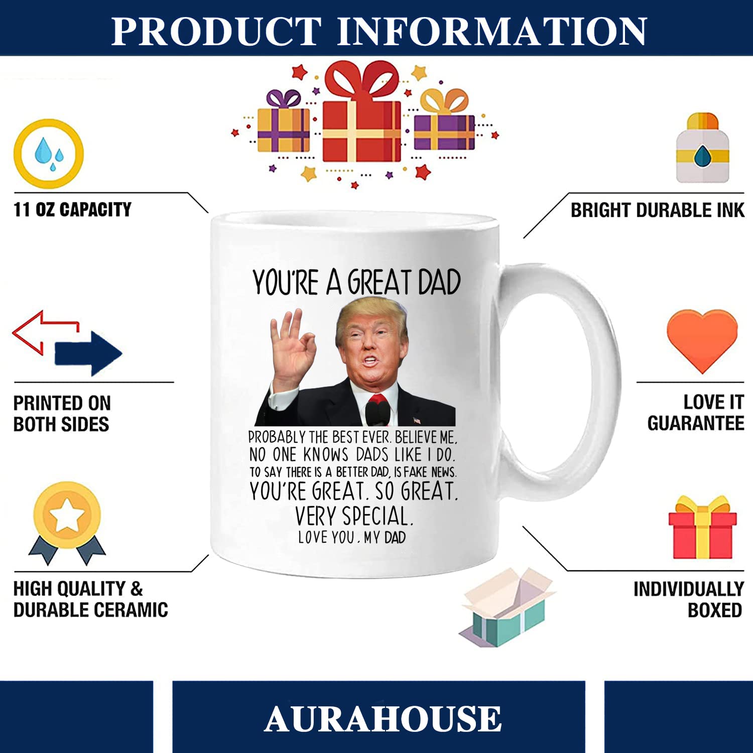 Nous nous engageons à fournir des tasses à café en céramique de haute qualité à nos clients. Dépêchez-vous de passer commande. La caractéristique intéressante de cette tasse à café unique en céramique est son œuvre. Design ergonomique : la tasse à café Trump est imprimée des deux côtés avec confort - Poignée en C - Super adaptée pour les gauchers ou droitiers - Capacité : 325 ml - Tasse en céramique adaptée pour un usage quotidien. Aurahouse Funny Gift for Uncle - You're A Great Uncle 11 Oz Il peut être un mug mignon, drôle ou adorable pour vos proches. Si vous êtes à la recherche d'un cadeau unique, voici ce qu'il vous faut. L'impression ne se décolorera jamais, peu importe le nombre de lavages. La tasse à café avec une illustration impressionnante n'est pas seulement un cadeau pour vos amis et votre famille, mais elle est également très bon marché et utile. Selon l'art, vos cadeaux peuvent se sentir détendus, aimés ou touchés lors de la réception. Cadeau idéal pour un beau-père : la tasse cadeau parfaite de la part de son fils et de sa fille qui convient à tout anniversaire, célébration ou fête des pères parce que vous devez dire à votre bien-aimé combien vous l'aimez. Great Dad Mug Gift ]It's a perfect gift for dad from daughter and son. Great dad trump mug, surprise him on his birthday or Father's Day, and let him know that he is the best father in the world Nettoyez-les facilement au lave-vaisselle sans vous soucier de l'usure. Aurahouse Mug « You're Great Father In Law Trump » - Tasse à IDEAL GIFT FOR STEP DAD - The perfect gift mug from son and daughter that is suitable for any birthday, celebration or father's day because you need to tell your loved one how much you love him. PREMIUM QUALITY The humorous coffee mugs are designed with solid ceramic construction and made of premium ceramic that is lead-free, cadmium-free Finition lisse à l'intérieur et à l'extérieur qui ne tache pas le café. La tasse à café est adaptée pour les boissons chaudes et froides. La large ouverture de la tasse Trump facilite le lavage à la main. En outre, il est étonnamment conçu avec des œuvres d'art expressives. Il deviendra rapidement sa tasse en céramique préférée pour boire à tout moment et n'importe où.
