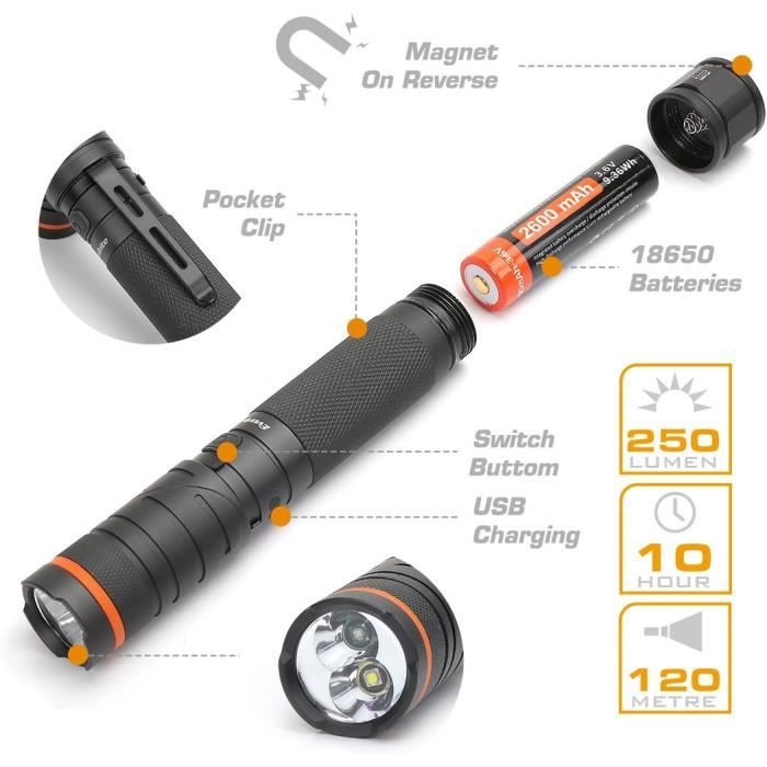 4 modes d'éclairage et zoom : lampes de poche rechargeables. Utilisations multiples : nous offrons une garantie gratuite de 730 jours pour les lampes de poche LED portables qui peuvent être largement utilisées pour l'éclairage quotidien, les pannes de courant, les urgences, etc. Lampe De Bureau Led, 5 Modes, Lampes De Table Dimmable 5 Niveaux De Spécifications techniques · Luminosité : 1200 lm · Portée : 1000 pieds · Batterie : 2500 mAh · Durée d'utilisation : jusqu'à 8 heures (mode faible luminosité... Durable et portable : l'étui pour petites lampes de poche LED est fabriqué en ABS de haute qualité + alliage d'aluminium avec une excellente dureté, résistance à l'abrasion et résistance aux chutes, de sorte que vous n'avez pas à vous soucier qu'elle tombe d'un bureau ordinaire ou dans les escaliers. Lampe De Poche Rechargeable Puissante Lampes De Poche LED Haute Puissance, Torche De Camping Zoomable Avec Perles De Lampe LED T6, étanche, 4 Modes D'éclairage, Chargeur USB Multifonction Lampe De Poche Puissante 4 modes d'éclairage différents : (fort/faible/stroboscopique/lumière latérale) Par exemple, vous pouvez l'utiliser comme veilleuse pour lire la nuit et le porte-clés en haut peut être accroché à l'intérieur de votre tente Lampe de poche LED super lumineuse : les lampes tactiques à haute luminosité disposent d'un nouveau noyau quadricœur avec une puissance de 750 lumens, une performance stable et une faible consommation d'énergie, donnant à la lampe une portée d'irradiation rechargeable élevée d'environ 200 m 4 modes, lampe de poche à intensité variable en continu, lampe de poche LED dispose de réglages de luminosité élevé, faible, stroboscopique, SOS, turbo et...