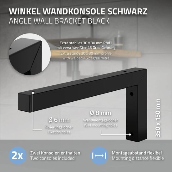 ML-Design Set 2x Consoles Murales, 350x150x30 mm, Blanc, Acier, Design Flottant, Support d'Étagère pour Lavabo/Meuble/Table pour Salle de Bain/Chambre à Coucher, Réglable, Matériel de Montage Inclus Grâce à ses lignes et arêtes claires et, ce support pour lavabo a une élégance sobre et s'intègre parfaitement dans chaque environnement. ML-Design Set 2x Consoles Murales, 350x150x30 mm, Noir, Acier, Design Flottant, Support d'Étagère pour Lavabo/Meuble/Table pour Salle de Bain/Chambre à Coucher... Les trous prépercés sont conçus pour un montage simple et rapide. Support parfait pour les lavabos, les étagères ou les bureaux, par exemple Cela permet aux personnes en fauteuil roulant de s'approcher au plus près. IDÉAL POUR UN HABITAT SANS BARRIÈRES ! Pour créer des plans de toilette personnalisés Livraison 2 x console murale de ML-Design Grande capacité de charge Pour créer ses propres meubles Soubassement pour plan de toilette Matériel de montage inclus (10 x vis, 10 x rondelles, 4 x chevilles) Ces équerres murales conviennent parfaitement à l'aménagement des salles de bains pour les personnes handicapées. Description du produit Ce support de haute qualité pour console de lavabo n'est pas seulement élégant, il fait également office de porte-serviettes. Plan De Travail Machine à Laver Et Seche Linge ML-Design Set 2x Consoles Murales En Forme De L, 350x150x30 Equerre Etagere Murale Capacité de charge recommandée jusqu'à 50 kg, en fonction de la nature du mur et de l'ancrage Tu ne peux guère monter tes meubles de manière plus efficace et plus moderne qu'avec cette console. Idéal également pour être utilisé comme support d'étagère - la fixation murale permet de faciliter le nettoyage du sol. De plus, le support revêtu par poudre confère un design intemporel qui, en plus, est très facile à entretenir et résiste à l'humidité et à l'eau. Châssis robuste en acier En tant que support d'étagère dans le salon ou le garage, il fait également bonne figure. Grâce à ses lignes et arêtes claires, ce support pour lavabo est d'une élégance sobre et s'intègre parfaitement dans chaque environnement. Acier de construction massif de 1,8 mm, profil sans soudure Surface blanche et brillante, Deux consoles incluses Design élégant et épuré Cette console pour charges lourdes est adaptée aux plans en bois, en MDF et en plastique. Les consoles murales en équerre conviennent parfaitement aux projets de bricolage et sont réutilisables. Consoles murales angulaires en forme de L de ML-Design Pour créer des lavabos individuels, comme support de table console ou comme étagère - dans la salle de bains ou dans la cuisine - ces consoles murales en angle en forme de L t'offrent une multitude de possibilités d'utilisation. Même si l'espace est limité, ces consoles sont la meilleure option. Parfaitement adapté aux lavabos, aux étagères ou aux consoles Étagère murale - Page 2 UTILISATIONS POLYVALENTES - Le support de haute qualité pour console de lavabo n'est pas seulement élégant, il sert également de support d'étagère. MONTAGE FACILE - Chaque console de lavabo est équipée des trous pré-percés dans la plaque de montage, ce qui permet un montage simple et rapide. Souligne ton excellent style et commande l'un de ces accroche-regards exclusifs ! DESIGN FONCTIONNEL - Grâce à sa forme en L moderne et bien pensée, notre support mural ne séduit pas seulement par son aspect, mais aussi par sa fonctionnalité. Matériel de montage de couleur assortie Capacité de charge recommandée jusqu'à 50 kg, en fonction de la nature du mur et de l'ancrage. Étagère Murale en Forme de L, Lot de 2, étagère d'Angle Suspendue, Tablette Flottante, Style