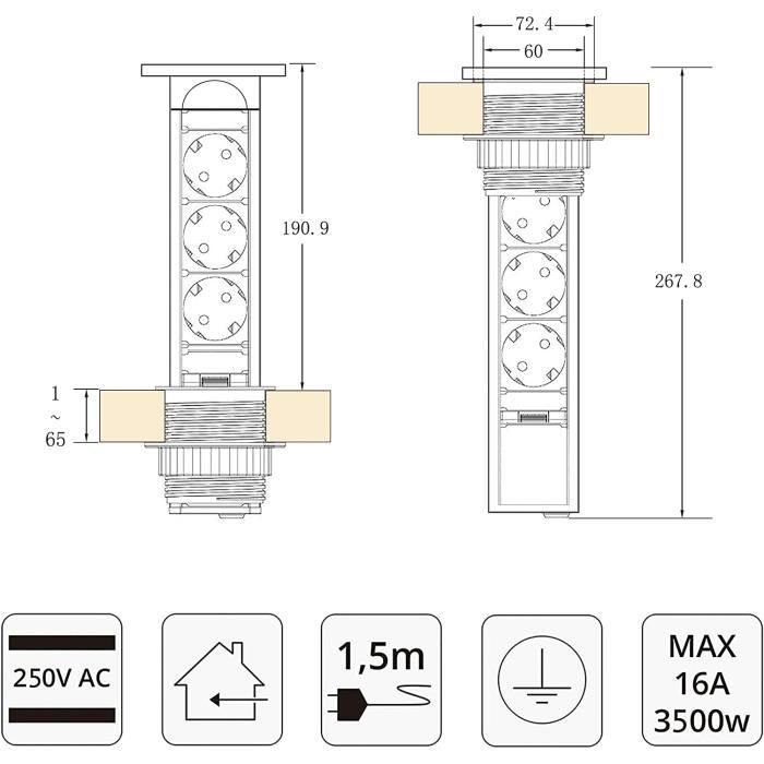 Branchez la prise de courant dans la position souhaitée conformément aux instructions d'installation. Haute sécurité La protection de surcharge et le contrôle parental sont intégrés ensemble. 🔌 [ SUR ET PRATIQUE ] Les fiches de courant ont une protection contre les surtensions et une sécurité pour enfants. Multiprise 10M 3prises De Terre 10A-16A 250V Avec 3 Valve De Protection Bleu 5492 Conception humanisée Facile à utiliser avec anneau de traction et bouchon coulissant. Pratique et toujours prête quand ont en a besoin. Dissimulé Table Multiprise Étanche Encastré Bureau Prise De Courant Pop... Il y a également une couverture étanche, qui protège de l'eau et des gouttes de café. Performance maximale de 3500W pour des besoins individuels et pour une utilisation à long terme. 🔌 [ L'INNOVATION ] Barrette de prises de courant rétractables à trois douilles. Idéal pour cuisine, salle de séjour et pour les bureaux. Prise de courant encastrée avec 2 prises SCHUKO 2 prises USB. Câble... Prise Usb C Multiprise Escamotable, Prise De Table Usb, Multiprise Encastrable Programmateur Prise Electrique Le corps principal de la prise est en matériau ignifuge.