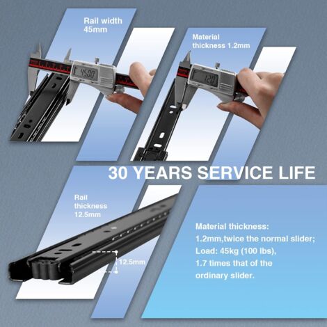 🏆[Complètement étiré et Robuste]La longueur tirée du coulissant de tiroir est égale à la longueur fermée. Fabriqué en acier laminé à froid Q235 avec une résistance à la traction > 400 MPa. Épaisseur: 2,5 mm, 4,2 fois le curseur normal; Charge: 220 kg (485 LB), soit 8,1 fois plus qu'un curseur normal.