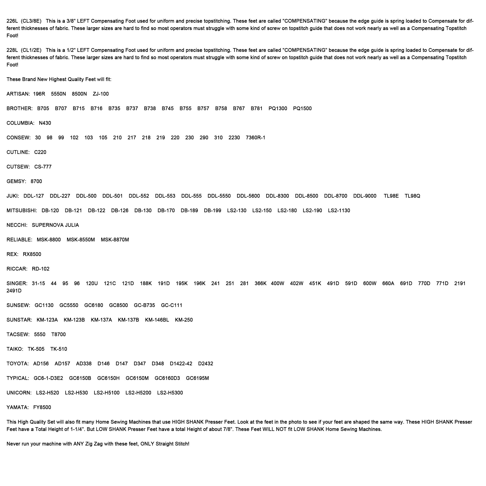 Pièce n° : KP-PF16E 1 ensemble Il s'agit d'un ensemble de 16 pièces des pieds de compression les plus populaires et couramment utilisés pour les machines à coudre à aiguille unique INDUSTRIEL. Ces pieds ne conviennent pas aux machines à coudre domestiques LOW SHANK. Ne faites jamais fonctionner votre machine avec n'importe quel zigzag avec ces pieds, seulement point droit ! Pied à coulisse numérique MarCal 16 ER jauge de profondeur rectangulaire 4103012 | Mabéo Industries Mais les pieds de pied à faible poids ont une hauteur totale d'environ 2,9 cm. Patrons Burda KP-PF16E ENSEMBLE DE PIED TOPSTITCH DE COMPENSATION DE 16 Jeu De Pieds Convient pour Juki : DDL-127, DDL-227, DDL-500, DDL-501, DDL-552, DDL-553, DDL-555, DDL-5550, DDL-5600, DDL-8300, DDL-8500, DDL-8700, DDL-9000, TL98E TL98E 8Q Veuillez regarder les pieds sur la photo pour voir si vos pieds ont la même forme. Convient pour Singer : 31-15 44 95 96 120U 121C 121D 188K 191D 195K 196K 241 251 281 366K 400W 402W 451K 491D 591D 600W 699A 699999999999999 A 1D 7700 D 771D 2191 2491D Surpiquer pour un très bon travail avec des tissus très légers.211 (CR1 / 16E) Il s'agit d'un pied compensateur DROIT de 1/16 po utilisé pour les surpiqûres uniformes et précises.Ces pieds sont appelés «compensateurs» parce que le guide de bord est à ressort pour compenser les différentes épaisseurs de tissu. et la taille de...