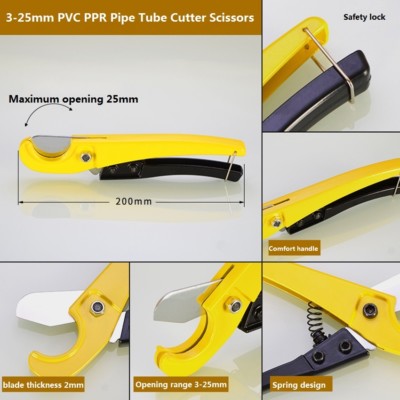 Juego de tijeras para tubos de plástico, dako , tagliatubi Cortador de tubos, Tijeras para tubos, Cortador de Tubos de Plástico, Corta Tubo de PEX, Tijeras para tubos de PVC, Cortatubos de PVC, Calibrador multifuncional para tubos compuestos de hasta 42 Tijeras para el corte de tubos de plástico hasta 42 mm . Cuchilla de acero inoxidable en forma de V que permite un corte limpio y rápido. Avance progresivo de cuchilla sin retorno. Fácil sustitución de la cuchilla. Retorno rápido de la cuchilla pulsando un botón. Con dos límites Comprar Tijeras Cortatubos Para Tuberías De PVC Y Polietileno. Medidas De 3 A 42mm En Cortador Tipo Tijera para Tubo de Pvc Plástico de 64 Mm · Garantía : 12 meses · Cuenta con capacidad de corte 45° : Si · País de Origen : México · Largo máximo de...