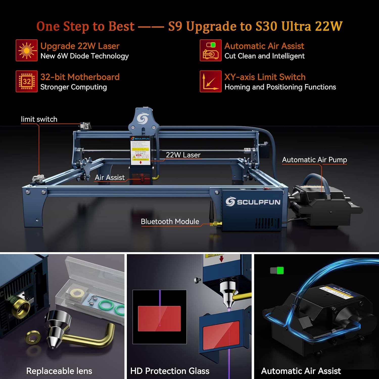 Lentille laser Avec une autre lentille laser Sculpfun S30 Ultra 22W ✨【Passage du S9/S6/S6Pro au S30 Ultra-22W】Kit de mise à niveau du S9 pour aider les utilisateurs du S9/S6/S6Pro à passer à la fonction principale du S30 Ultra-22W. Vous pouvez graver différentes couleurs en définissant une puissance et un intervalle de ligne différents. ✨【Interrupteur de fin de course à axe XY Sculpfun S9】Il est parfaitement adapté à la machine Sculpfun S9 et peut être installé et utilisé directement. ✨【Assistance d'air automatique】1., Efficacité de coupe considérablement améliorée, surface de coupe plus propre, pas de traces de type fumée., 2., Le débit d'air à haute vitesse de 13,5 m/s combiné avec le embout d'assistance d'air permet d'augmenter la vitesse de coupe du contreplaqué et de la planche MDF de plus de 5 fois., 3., Protéger la lentille laser. Version améliorée de Sculpfun S9/S6/S6Pro après assemblage Laissez votre Sculpfun S9 / S6 / S6Pro couper plus rapidement et plus parfaitement Découvrez le module laser Sculpfun S9, idéal pour gravure ultra-précise sur 30 matériaux. Connectivité Wi-Fi, interface tactile et protection œil intégrée Prise en charge de la connexion sans fil SCULPFUN S9 Machine de gravure laser, Sculpture sur bois 15 mm, Protection des yeux, installation rapide, pour bois, cuir, métal, bricolage Après avoir installé l'interrupteur de fin de course, la machine démarrera la fonction de positionnement et de positionnement initial, ce qui est très approprié pour le positionnement répété ou les travaux de fabrication en série. Lorsque la lentille est endommagée ou après une utilisation à long terme, la lentille peut être remplacée pour restaurer sa puissance de coupe. Conception de la fenêtre à ouverture arrière Aide à souffler rapidement la fumée vers l'arrière Verre de protection HD Bloquer efficacement la lumière éblouissante, pratique pour l'observation LightBurn (avec fonction d'assistance à l'air M8), LaserGRBL, LightBurn, Benbox, GrblController, LiteFire, prend en charge le système Windows, prend en charge le système MAC. Une lentille gratuite est incluse dans le package avec l'achat, les lentilles sont très bon marché et peuvent être facilement achetées chez SCULPFUN.7.Nouveau bouclier oculaire laser de mise à niveau : le kit de mise à niveau est équipé d'un bouclier oculaire en verre amovible, qui ne sera pas éblouissant même si vous ne portez pas de lunettes. SCULPFUN S9 odule laser, odule de gravure laser à effet 90 W avec... Les machines sans guides linéaires n'ont pas besoin de fils adaptateurs, sinon la direction de l'axe X sera inversée. Réaliser des fonctions de positionnement et de prise d'origine répétées Après avoir ajouté des interrupteurs de fin de course, S9/S6/S6 Pro peut réaliser la fonction de positionnement de prise d'origine/répétition, ce qui est très approprié pour la production par lots d'un grand nombre de travaux. Les performances globales sont considérablement améliorées, ce qui permet d'obtenir une vitesse de coupe plus rapide et un effet de coupe plus stable., 2., Ajout de la commande d'assistance d'air automatique et de la fonction de connexion sans fil Bluetooth. ✨【Carte-mère assistée d'air 32 bits améliorée】 1., La dernière carte mère de 32 bits a une puissance de calcul plus forte que la carte de contrôle principale du S9 (8 bits). Découpe Laser SCULPFUN Module Laser S9 S30 Kit De Mise à Niveau 22 W Machine De Graveur Laser Formats de fichiers pris en charge : NC, BMP, JPG, PNG, DXF et autres formats d'image. Et réservez la fonction de contrôle hors ligne de la carte SD (vendue séparément en tant que kit de mise à niveau). Le package comprend le laser Sculpfun S30 Ultra-22W, la carte-mère S30 Ultra, la pompe à air S30 Ultra, un tube d'air, un interrupteur de fin de course, un adaptateur d'alimentation S30 Ultra, des câbles, des vis, un kit d'entretien du laser, etc. Si la direction du moteur de l'axe X est à droite comme le S30, le S30 doit utiliser un câble adaptateur.