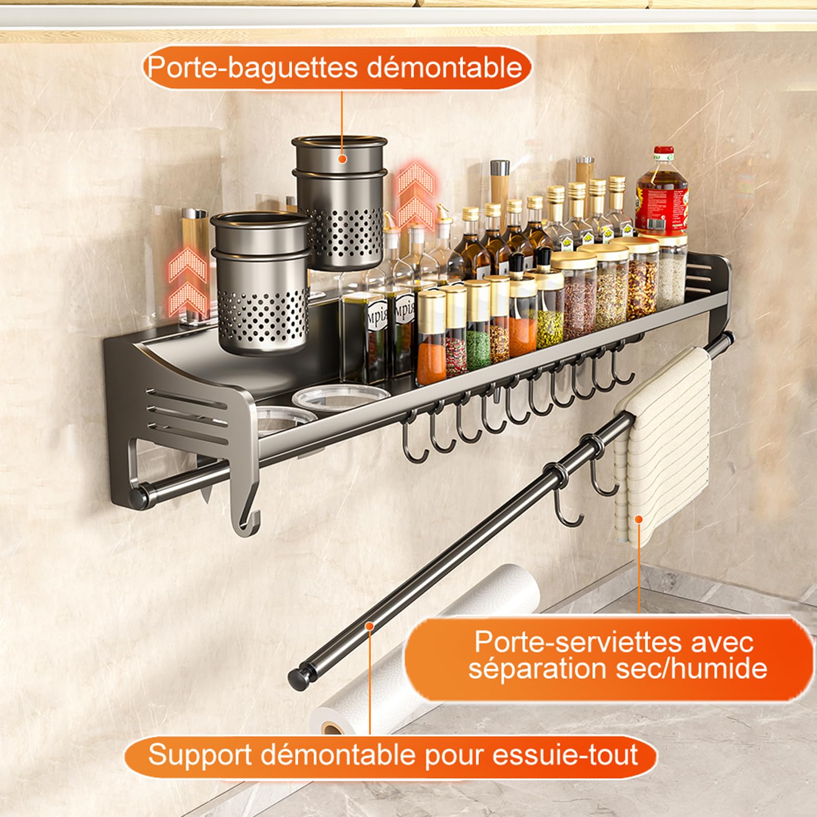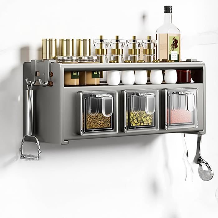 ★Matériau : cette étagère à épices de cuisine est fabriquée en alliage aluminium-magnésium, possède des propriétés anti-oxydantes. FINDIR Étagère à épices Support Rangement Ustensiles de Cuisine Mural Étagère À Épices, Porte-Épices Murale Sans Perçage, Etagere Epices En... Etagere A Epices Murale Giural Gris,50cm,Étagère à Épices Murale, Rangement Epices Cuisine Suspendue, Etagere Cuisine Avec Crochets Et Porte-Rouleau De Cuisine, Porte Épices Etagere Epices Murale Il ne peut pas être utilisé sur des murs irréguliers et instables tels que les murs peints, les papiers peints et les murs en plâtre. Étagère à épices de Cuisine Murale, Porte-épices Acier Inoxydable, sans... ★ Zone de placement des épices indépendante : chaque bouteille d'épices a son propre espace, ce empêche efficacement les épices de se mélanger les aux autres, vous permettant de profiter d'un délice pendant le processus de cuisson. ★Instructions d'installation : le mur doit être constitué de carreaux de verre plats et solides, etc. ★ Peut être fixé au mur et placé sur la table : il peut être facilement installé sur le mur de la cuisine pour économiser de l'espace sur le plan de travail, ou il peut être placé directement sur le plan de travail pour répondre à différentes configurations de cuisine et habitudes d'utilisation. Fonction : polyvalent Matériau : acier au carbone Classification des étagères : étagère à épices✅[Peut mettre une variété de bouteilles d'épices] : un arrangement raisonnable peut être placé dans une variété de fournitures de cuisine, un stockage puissant.