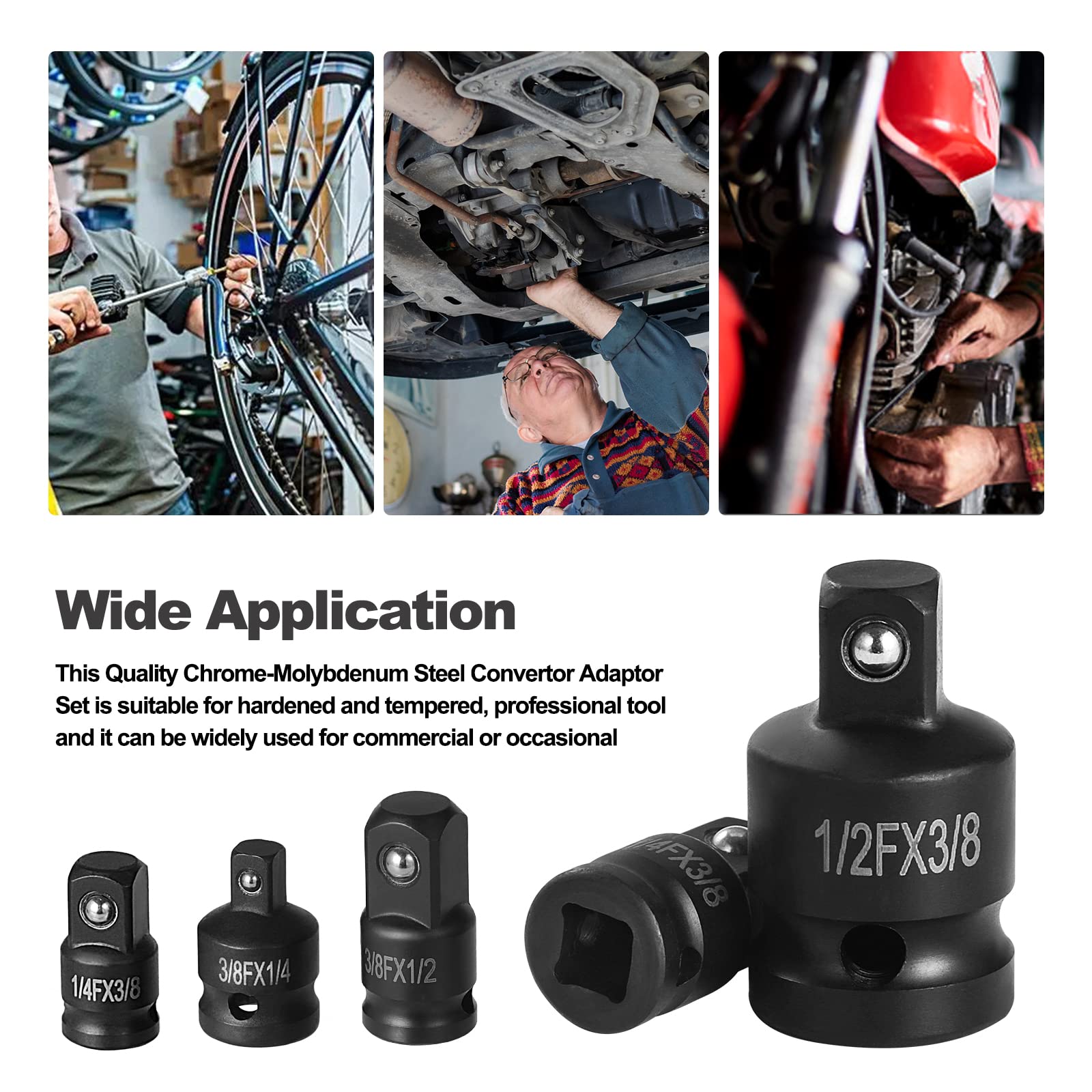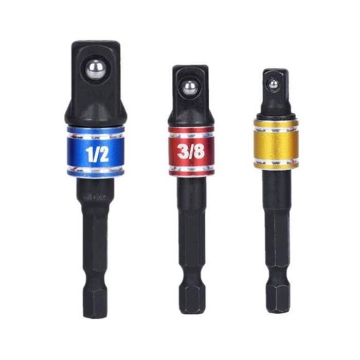 Appliquez une légère couche d'huile ou de protection contre la rouille., b). Inspectez régulièrement les outils et remplacez immédiatement les pièces endommagées ou usées pour éviter les dysfonctionnements. Idéal pour une utilisation mobile, dans les espaces restreints ou pour un accès rapide dans une boîte à outils. JEU DE 5 ADAPTATEURS CARRE CLIQUET - SARLAT OUTILLAGE Description du produit Lot de 4 adaptateurs de prise à choc Ginour Compatibilité étendue : Le jeu de 4 adaptateurs comprend les combinaisons de tailles courantes : 1/2 vers 3/8, 3/8 vers 1/2, 3/8 vers 1/4 et 1/4 vers 3/8. Jeu de clés à douilles articulées - hexagonales - entraînement carré... Design compact : Les adaptateurs sont compacts, légers et faciles à transporter. Ajustement précis et verrouillage à bille : Chaque adaptateur dispose de raccords carrés usinés avec précision et d’un mécanisme de verrouillage à bille intégré, assurant un enclenchement sûr sur les cliquets et les douilles – sans glissement ni jeu. Permet de connecter facilement des outils avec différentes tailles d'entraînement pour une utilisation rapide et flexible – Parfait pour les réparations automobiles, l'entretien de motos, les garages à domicile et l'entretien des machines. Utilisation polyvalente et compatibilité : Convient à tous les outils standard avec un entraînement de 1/4, 3/8 ou 1/2 – y compris les clés dynamométriques, les cliquets et les douilles. Découvrez notre sélection de 40 produits Coffrets de douilles et accessoires à chocs 1/2. Profitez de nos meilleurs prix, promotions et délais sur un large choix de références en stock ou avec une livraison en 24/48 heures chez vous Clés à Cliquet Coffret De Douilles Et Embouts 202 Pièces, Ginour Coffret Douille Cliquet 1/4 L'ensemble d'adaptateurs de douille universels Ginour comprend 1/2 F x 3/8 M, 3/8 F x 1/2 M, 3/8 F x 1/4 M, 1/4 F x 3/8 M.