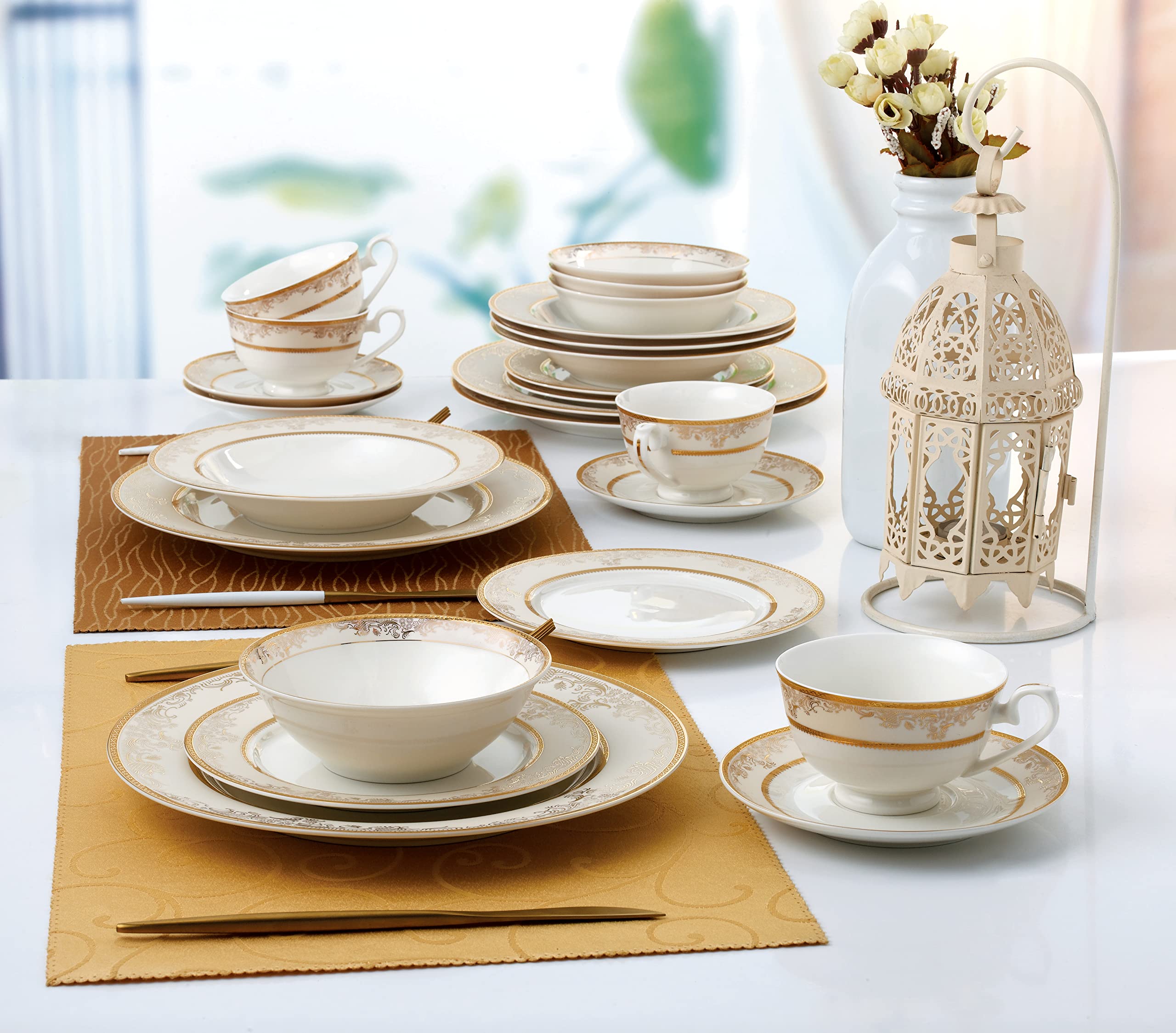 Cet ensemble dispose d'un bord ondulé avec une bordure dorée élégante et élégante. Idéal pour le divertissement L'ensemble comprend une assiette plate de 10,2 à 26,7 cm, une assiette creuse de 10,2 à 20,3 cm, une assiette à salade de 10,2 à 17,8 cm, une tasse à café de 113,4 à 198,4 g et 4 soucoupes, un bol à fruits/céréales de 10,2 à 14 cm., Passe au lave-vaisselle. Assiette De Presentation Doré Vente Services à Table En Tunisie: Élégance Abordable Assiette Dore Un bon service et des prix compétitifs sont disponibles. Le motif Mabel de la collection La Luna de Lorren Home Trends est un motif artistique et ludique, orné d'un élégant motif de volutes dorées bordées de bordeaux, sur une porcelaine tendre translucide et légère Idéal pour un usage quotidien ou assez élégant pour une occasion spéciale. Cet ensemble de vaisselle en porcelaine à bord ondulé de 24 pièces est un service complet pour 4 personnes. Il présente un bord ondulé avec une bordure dorée élégante. Fabriqué en porcelaine fine et durable. Idéal pour un usage quotidien ou assez élégant pour une occasion spéciale Forme de l'article : ronde Fabriqué en porcelaine fine et durable avec une bordure dorée brillante Vaisselle de restaurant moderne en vente chaude Assiette à steak
