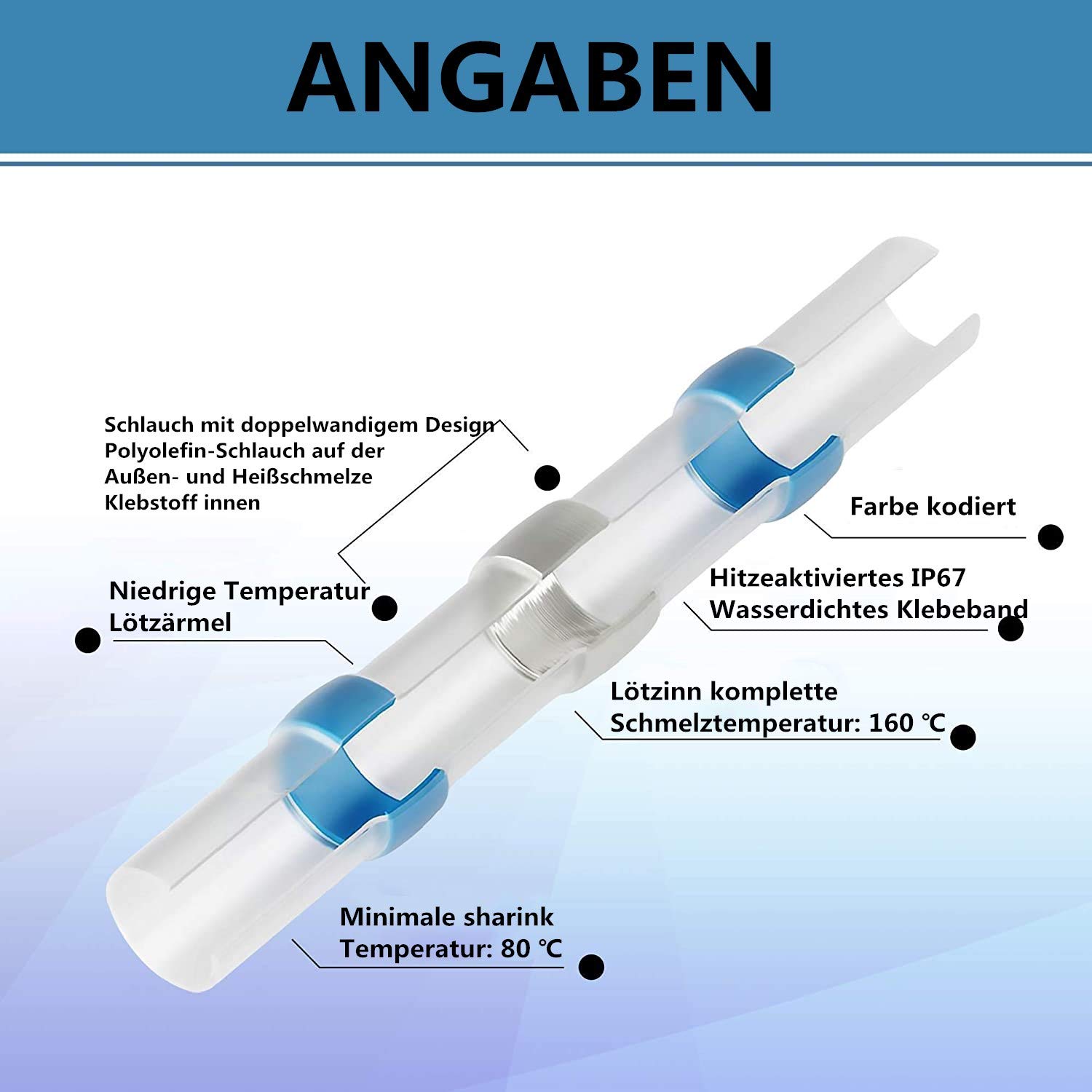 Évitez une surchauffe locale du gaine thermorétractable. Permet une inspection visuelle, l'adhésif thermofusible et la soudure à l'intérieur des tubes isolés en polyoléfine créent un joint étanche durable entre le câble et la fiche, empêchant ainsi la corrosion. Connecteur De Fil à Souder VOARGE Lot De 50 Connecteurs à Souder Thermorétractables étanches Connecteur à Souder Leroy Merlin Facile à utiliser : connecteur à souder très pratique, raccordement, soudure et gaine thermorétractable tout en un. L'aspect transparent offre une inspection claire lorsque les bandes et les fils sont insérés à l'intérieur. Lorsque la chaleur est appliquée, les gaines rétrécissent et la soudure fondue s'écoule à travers les fils dénudés, assurant une fixation solide et empêchant les fils de glisser hors de la borne. Mode d'emploi : Pourquoi choisir l'étain ? Contrairement au cuivre, l'étain est résistant à la corrosion. Sûr et respectueux de l'environnement : la gamme de connecteurs de câbles se compose de gaines thermorétractables isolées, respectueuses de l'environnement et ignifuges, qui garantissent une résistance élevée à la traction, une étanchéité à l'eau et une fonction anti-fuite d'électricité. Veuillez vérifier la température de la chaleur pour éviter les brûlures. Livré chez vous au meilleur prix : VOARGE Lot de 50 connecteurs à souder thermorétractables étanches - Connecteurs thermorétractables - Bornes de connecteurs à Cosses Et Kits VOARGE Lot De 50 Connecteurs à Souder Connecteurs à souder thermorétractables - HURRISE - 100pcs - Blanc... Sélectionnez la bonne taille de prise pour les câbles. Avec un point de fusion plus faible, les connecteurs de fil thermorétractables sont plus faciles à utiliser. Étanche et isolant : conception à double paroi : tube en polyoléfine à l'extérieur et adhésif thermofusible à l'intérieur. Caractéristiques du produit : Connecteur à souder blanc, 0,25-0,34 mm² (awg : 26-24) Connecteur à souder rouge, 0,5-1,0 mm² (awg : 22-18) Connecteur à souder jaune, 4,0-6,0 mm² (awg : 12-10) Connecteur à souder bleu, 1,5-2,5 mm² (awg : Étanche : IP 67 - Résistance à la tension : 1 kV / mm - Température de fonctionnement : de -55 °C à 125 °C - Température minimale de sharink : 80 °C - Température de fusion totale : 160 °C - Matériau : étain en polyéthylène. Le kit de connecteurs à souder de qualité supérieure de Voarge assure un contrôle précis, une étanchéité fiable et une facilité d'utilisation. Avec des caractéristiques uniques et une haute résistance, ce produit est un incontournable pour vos projets de câblage
