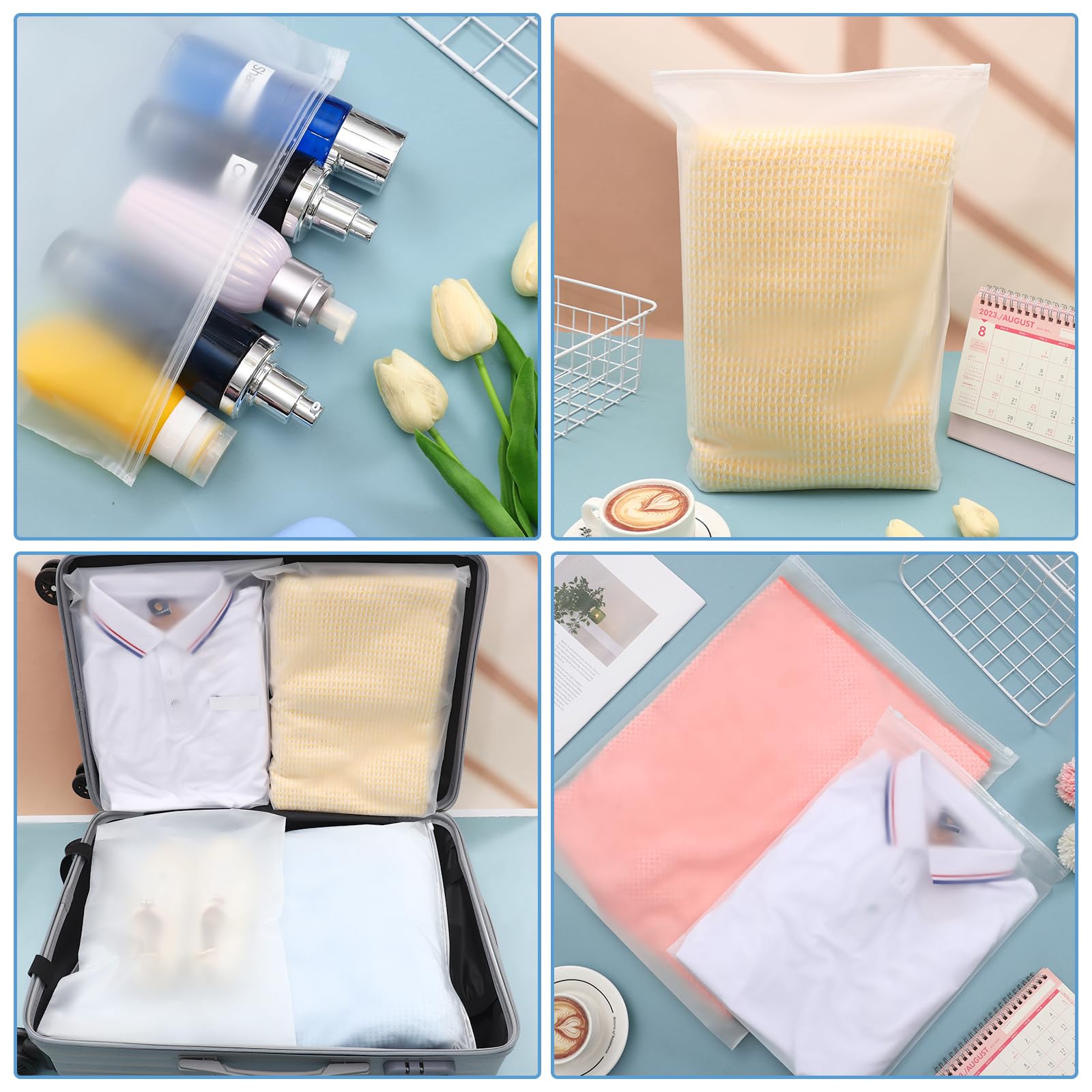 Rangez vos vêtements Vous pouvez ranger vos vêtements d'été en hiver. 100 microns d'épaisseur, les sacs sont également durables et peuvent résister à l'usure régulière. Économisez de l'espace et séparez vos vêtements secs et humides de manière sûre. Les sacs sont polyvalents et peuvent être utilisés pour le rangement quotidien, les voyages ou l'emballage professionnel de vêtements. Lot de 10 sacs de rangeent sous vide, sacs éconoiseurs d'espace avec Répond à vos besoins de rangement de vêtements, essentiels de voyage et chaussures., 2., Un sac d'emballage sophistiqué pour les vêtements, les chaussures, les foulards., 3., Imperméable et sans trou, il est très approprié pour séparer vos vêtements secs et humides dans les bagages lors de vos déplacements. Les sacs sont parfaits pour tous ceux qui veulent garder leurs affaires en sécurité et organisées lors de leurs déplacements ou à la maison. Surface imperméable, ils peuvent garder vos affaires en sécurité et au sec. Description du produit Nos sacs à fermeture éclair givrés en polyéthylène sont sûrs, élégants et fonctionnels. Facile à utiliser et à réutiliser. ❀Élégant : la texture givrée du sac à vêtements lui donne un look chic et sophistiqué, tandis que le petit motif chrysanthème ajoute une touche de personnalité et de style. Sweat à capuche surdiensionné pour fee, anches longues et fereture... Surface givrée et motifs chrysanthèmes La surface givrée et l'attribut transparent facilitent le rangement de vos effets personnels dans les classifications. Grand Sac Lot De 20 Sacs à Fermeture Éclair 40 X 50 Cm En Plastique Amovibles Pour Vêtements De Voyage - Pour Pulls Et Manteaux Fermeture Eclair 40 Cm Application - Nos sacs à fermeture éclair réutilisables en plastique transparent sont adaptés pour ranger des vêtements, des sous-vêtements, des serviettes, des chaussettes, des chaussures, etc., adaptés pour les voyages, la famille, l'hôpital, l'école, etc. Fini les petits objets perdus et protège parfaitement vos articles de la saleté Essentiels de voyage Classez vos blongings de voyage. ❀ Fermeture éclair : design pratique à fermeture éclair qui facilite l'ouverture et la fermeture du sac de rangement pour vêtements, permettant un accès rapide à vos effets personnels. Sacs économiseurs d'espace réutilisables de haute qualité. Quantité : Lot de 50 Dimensions : 28 x 40 cm Taille utile : 26,4 x 38,1 cm Matériau : polyéthylène Surface : surface givrée Épaisseur : 100 microns Trou : sans trou Vous pouvez dire avec dérision ce qu'il y a dans le sac.