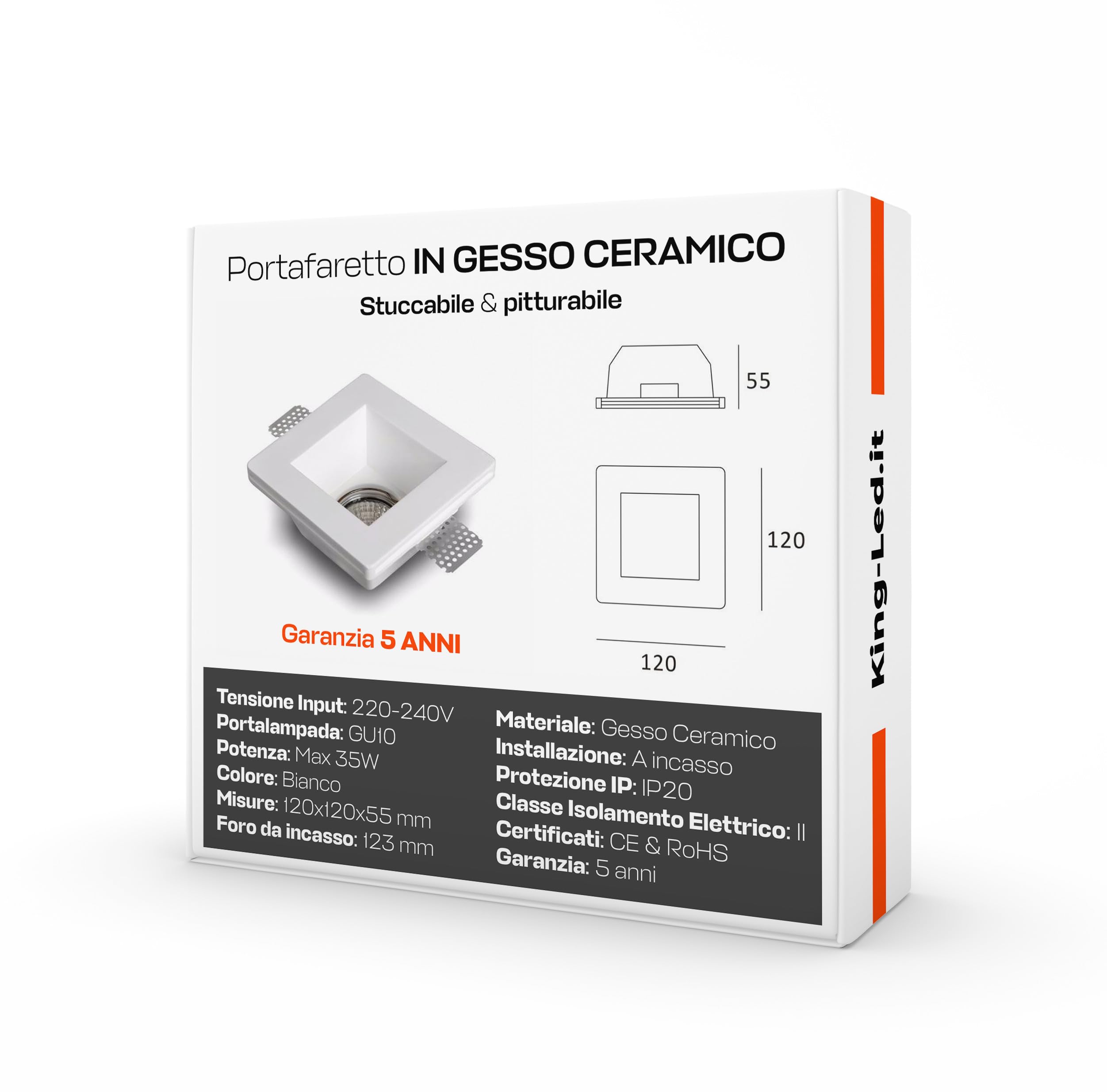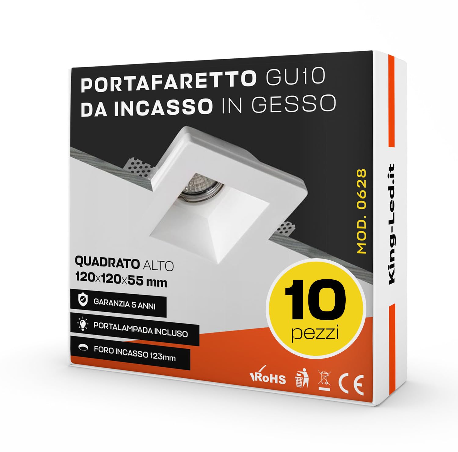 Travaillé dans les moindres détails, il se présente avec des lignes précises et finies et avec l'absence totale de trous sur la surface. La surface lisse et non poreuse rend ce encastrement facile à cacher. Garantie 2 ans - Tecno&Led est une marque déposée. LEDLUX Lot de 10 spots encastrables en plâtre céramique pour contre-plafond, douille GU10 incluse couleur blanche à peindre anti-rayures (carré 100 x 100 mm Support spot encastrable en plâtre céramique de très haute qualité, à peindre et facile à installer. Matériau : plâtre céramique., Couleur : blanc. Compatible avec tous les modèles des spots GU10 et MR16 de 5 cm de diamètre · Peut être peint et intégrable parfaitement en placoplâtre · Plâtre céramique de... Compatible avec tous les modèles des spots GU10 et MR16 de 5 cm de diamètre La structure s'intègre parfaitement au plafond. Dimensions : 100 x 100 x 30 mm. Vendu et expédié par Tecno&Led S., r., l. Spot encastré LED GU10 et GU5.3 (MR16) carré avec corps en plâtre blanc... Spot Carre Tecno&Led® - Porte Spot En Plâtre Céramique Carré Peint Slim 10 X 10 Cm Avec Fer Ferme Spot Culot GU10 Pour Spot Spot Noir Plafond Caractéristiques techniques : forme carrée.