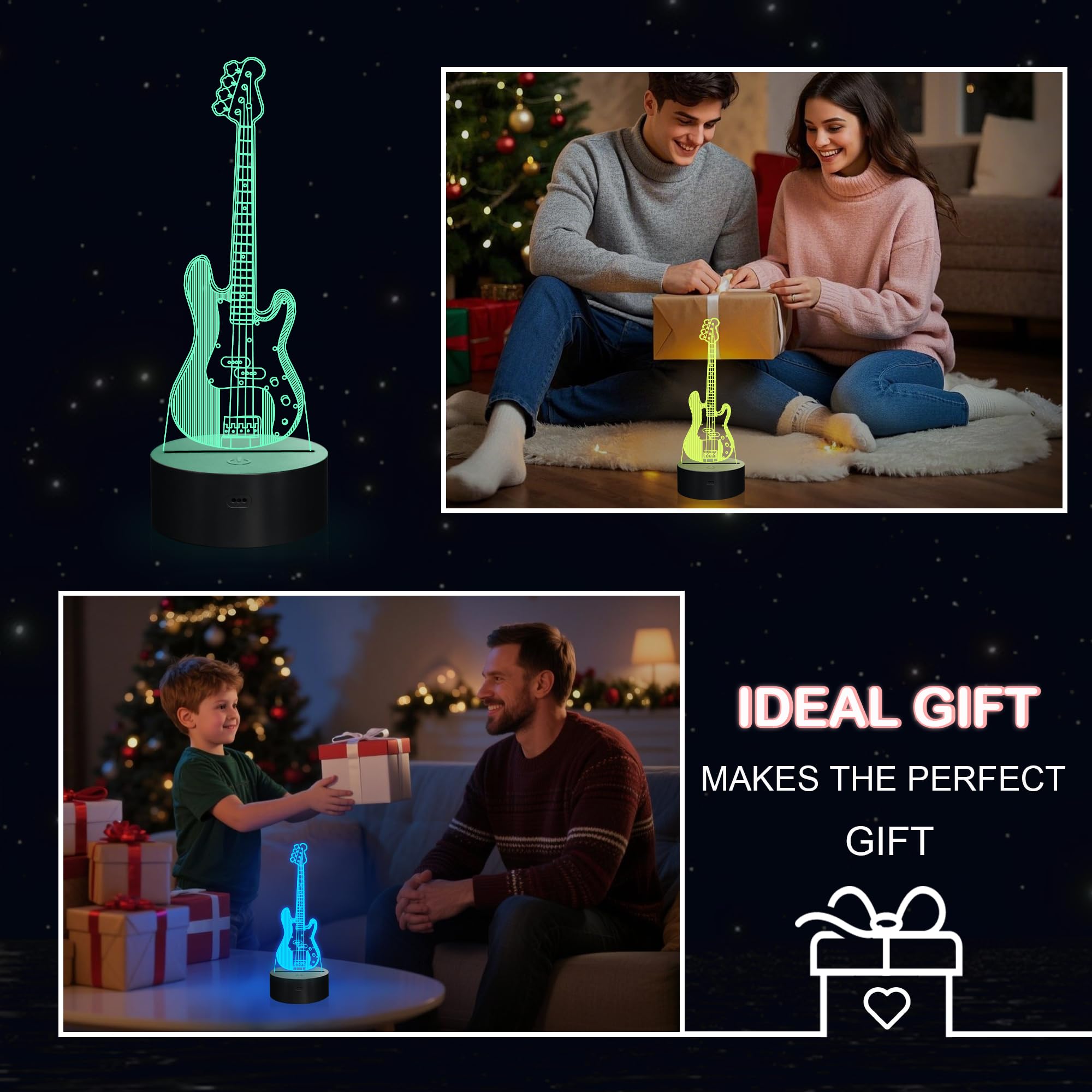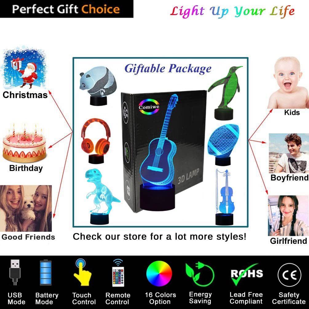 Télécommande + minuterie + variateur + Smart Touch : la nouvelle version améliorée de la veilleuse de guitare peut être réglée de 15 minutes à 12 heures. Utilisé dans la chambre d'enfant, la salle de bain de bébé, le salon, le couloir, l'étude, le bureau, la décoration de bar Service satisfaisant : ★ Achat sûr pour tous les problèmes de qualité. Matériel: acrylique + ABS Poids de l'emballage : 300 g. Consommation d'énergie : 0,012 kWh/24 heures ; 4,38 kWh par an. La veilleuse pour enfants est un jouet unique pour tous les petits fans des amateurs de guitare et a un sens de l'humeur. C'est un cadeau parfait pour un anniversaire, Noël ou des vacances pour les garçons et les filles. YuanDian Guitare Lampe 3D, Illusion Optique LED Guitare Électrique ✔ Ce n'est pas seulement une veilleuse pour les enfants, mais aussi pour les grands garçons et les hommes. Contenu de l'emballage : 1 plaque acrylique., 1 base en ABS., 1 câble USB., - 1 x télécommande. Guitare Decoration Veilleuse Fantaisie 3D En Forme De Guitare électrique - Lampe Tactile De Table Ou De Bureau - 16 Couleurs Changeantes - Télécommande - Décoration D'intérieur - Cadeau De Noël Ou D'anniversaire Lampe Guitare Ne convient pas pour la lecture ou comme source de lumière principale. Nous sommes là pour vous : si cela ne fonctionne pas pour vous pour une raison quelconque, veuillez nous contacter via Amazon, nous vous répondrons dans les 24 heures Pourquoi choisir notre marque Attivolife ? ✔ Une toute nouvelle veilleuse 3D en forme de guitare lumineuse et le meilleur choix pour la décoration de la pièce. Puissance du produit : 0,5 W. La lampe de chevet a été soigneusement testée avant la livraison. Lumière LED de qualité supérieure avec une lumière douce, uniforme et non vacillante qui ne nuit pas aux yeux de l'enfant. Attivolife est synonyme de qualité de notre veilleuse pour les cadeaux de guitare. Effet visuel 3D créatif : la lampe de guitare est composée d'une gravure au laser sur une plaque acrylique optique pour montrer l'illusion 3D visuellement étonnante. Cadeau créatif : la lampe hologramme pour guitare peut rendre le coin sombre de la maison plus attrayant la nuit. Veilleuse à illusion d'optique LED 3D avec télécommande et... 3D Lampe Illusion Optique LED Veilleuse,Lampe LED Illusion avec 16... C'est une excellente décoration pour la chambre à coucher Il impressionnera certainement vos invités lorsqu'ils entreront dans la pièce.