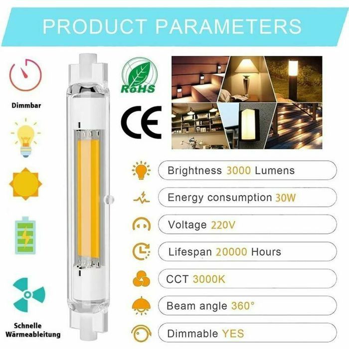 Découvrez l'ampoule LED R7S 9W 900 lm COB 135mm de LEDKIA LIGHTING, une avancée dans l'éclairage moderne. Ledkia Ampoule LED R7S pour luminaire - Ampoule LED - Rue du Commerce Ampoule LED R7S catégorie ampoules - 9 W - 900 lm - COB - 360° - 3000 K blanc chaud - IP20 - Allumage instantané - IRC 80 · Descriptif · Éclairage R7S efficace... 🔧 Installation rapide et facile : L'ampoule LED R7S est conçue pour une installation rapide et facile ; insérez simplement l'ampoule dans le support de lampe R7S et profitez d'une lumière vive et constante ; évitez de l'utiliser dans des luminaires fermés pour garantir une longue durée de vie Évitez les luminaires fermés et limitez son utilisation continue à 12 heures pour une performance optimale. Sa conception compacte, avec un diamètre de 14mm, s'adapte à la plupart des luminaires R7S, offrant une flexibilité dans votre choix d'éclairage. Idéale pour ceux qui recherchent une solution d'éclairage durable et efficace, cette ampoule convient aux environnements résidentiels et professionnels. de nos produits peut être affectée par des facteurs tels que la lumière ambiante, le calibrage de son écran, l'angle de visionnement ou l'appareil utilisé par chaque utilisateur. Choisissez parmi trois températures de couleur pour créer l'ambiance souhaitée dans votre maison ou votre espace de travail., Sa durabilité de 40., 000 heures garantit un éclairage fiable et constant pour les années à venir. Faites l'expérience d'une lumière qui transforme votre quotidien avec LEDKIA LIGHTING. Commandez avant 17h pour une livraison express en 24h sur . Livraison standard ou point relais gratuite dès 50€. Ampoule LED tube R7. Note moyenne avis site de 4,51 sur 5 Lampe Halogene De Bureau LEDKIA LIGHTING - 9W | 900 Lm COB | Économie D'énergie | Faisceau Lumineux 360° | Adaptable Aux Lampes R7S, Blanc Chaud 3000K Ampoule Led R7s Le client doit tenir compte du fait que les retours effectués pour des raisons non liées au fonctionnement du produit seront à sa charge.