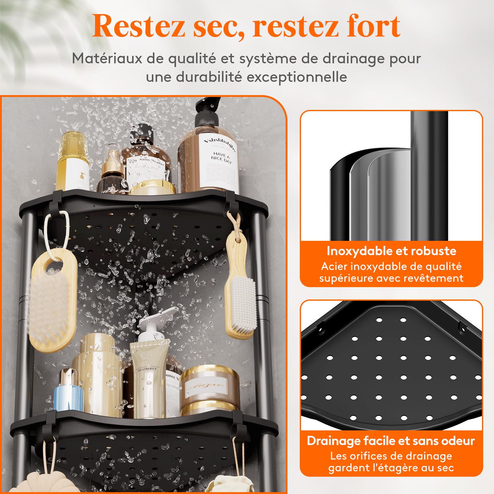 ✔️ Facile à monter - Votre nouvelle étagère de douche peut être collée ou percée. Vos avantages en un coup d'œil : 2 variantes de montage : À coller ou à visser. Il y a 2 façons confortables d’utiliser votre nouveau porte-douche. Modèle simple et sans complications. Vos éponges et brosses trouveront leur place sur les crochets de l'étagère de salle de bain. Cette étagère d'angle peut également être utilisée dans une chambre d'enfant, dans la cuisine ou dans le garage. Etagère salle de bain sans percer - Élégance et Praticité au Quotidien Cette étagère pour salle de bain allie design moderne et fonctionnalité. Conçue en fer forgé, elle offre une installation sans perçage tout en apportant une touche d'élégance à votre salle de bain. Pratique et robuste, elle est idéale pour organiser vos produits de toilette avec style. Installation Simple... Vous apprécierez l’ordre et d’avoir plus d’espace dans votre cabine de douche. Veuillez noter dans la variante de collage qu'une paroi lisse sans poussière ni graisse est requise. + Bords soigneusement polis et ébavurés. ✔️ Flexible & amovible – les pastilles adhésives peuvent être retirées sans laisser de traces. Achetez dès maintenant l’étagère de douche Greenroxx sans risque., - Etagere Angle Salle De Bain Etagere Douche Angle Emco Loft Panier à éponge à Visser, étagère De Douche En Aluminium De Qualité Supérieure Avec Insert En Plastique Amovible, Panier De Douche Pour Accessoires De Salle De Bain étagère Angle Sans Perçage + Matériau en aluminium léger mais résistant. + Retrait des adhésifs possible sans laisser de résidus. L'étagère de douche robuste a été conçue en Allemagne et est bien sûr polie, ébavurée et inoxydable. étagère mobilier design pour décoration d'intérieur Placez le support de douche peu encombrant à la hauteur souhaitée, de sorte que vos accessoires de douche sont toujours à portée de main.