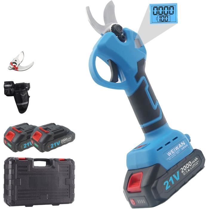Idéal pour couper avec précision les branches, les arbustes, les haies et les petits arbres, il offre une manipulation confortable et de longues heures de travail sans interférence. LDL coupe branche sans fl PARKSDE PAAS 20-L B1 20V 28MM type... Système de lubrification des lames pour 176753493547 Design léger et ergonomique - Le coupe-branches est léger et dispose d'une poignée caoutchoutée qui offre confort et contrôle précis même en cas de travail prolongé. Deux batteries lithium-ion 21 V - Le kit contient 2 batteries qui permettent un travail prolongé sans charge fréquente, et la technologie Li-ion garantit que les batteries ne perdent pas leur capacité au fil du temps. Design léger et ergonomique : travail confortable sans fatigue des mains, même en cas d'utilisation prolongée. Moteur sans balais puissant - Le coupe-branches alimenté par batterie est équipé d'un moteur sans balais qui offre 40 % d'efficacité en plus et une durée de vie plus longue par rapport aux modèles traditionnels. Kit avec mallette de transport et accessoires gratuits - La livraison comprend un couteau de rechange, une pierre à aiguiser, un chargeur et une mallette de transport pratique qui permet un rangement pratique et un transport facile de l'outil et des accessoires. Accessoires supplémentaires - Mallette de transport, chargeur, lubrifiant, pierre à aiguiser et GRATUIT : lame de rechange. Coupe précise et puissante - Les lames en acier inoxydable trempé coupent les branches jusqu'à 30 mm d'épaisseur et garantissent des coupes rapides, précises et douces pour une croissance saine des plantes. Coupe Branche Electrique WEIWAN Sécateur électrique Sans Fil Professionnel, Moteur Sans Balais Sécateur à Batterie Vistefly V15MAX aspirateur sans fil moteur principal... Dragro Sécateur électrique professionnel sans fil alienté par batterie