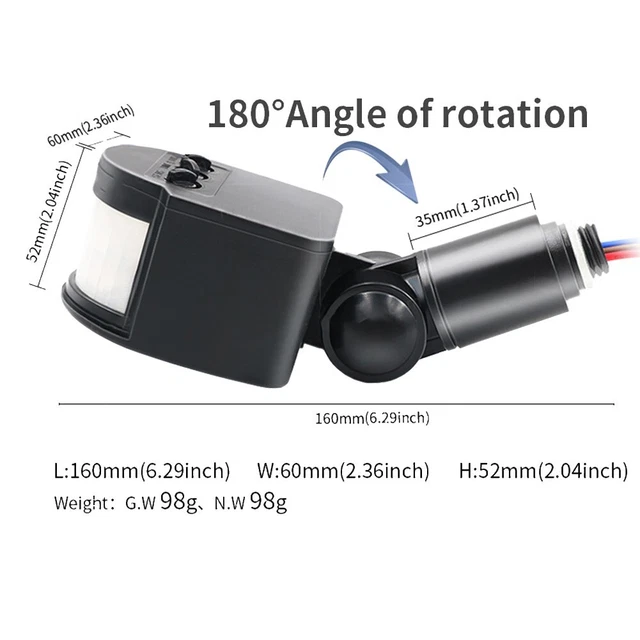 6 x 4,7 x 15,6 cm / 2,4 x 1,9 x 6,1 pouces Poids : env. Veuillez prendre le vrai par défaut. 【 et Écoénergétique】L'interrupteur est fait d'ABS robuste, garantissant une longue durée de vie. INTERRUPTEUR DÉTECTEUR DE Mouvement Capteur Lumière EUR 10,90 - FR Spécifications : État : Neuf Couleur : Noir Matériau : ABS Rotation de travail : 180 ° Tension : 90 V~250 V CA Norme : LVD, pour EMC, CE, RoHS Classement IP : application intérieure IP64 Réglage LX : 2-2 000 lx (réglable) Temps d'éclairage par induction : 5s ~ 6min temps réglable Distance de détection : env. Cela rend cet interrupteur idéal pour une utilisation dans les grands espaces ou les zones à fort trafic. Réglage du minuteur : 2 Commutateur de détecteur de mouvement LED extérieur 90 250 V 180 degrés [Paramètres]Rotation de fonctionnement : 180 ° ; tension : AC... Vous pouvez régler la durée pendant laquelle les lumières restent allumées après avoir détecté mouvement (entre 5 secondes et 6 minutes), vous donnant ainsi contrôle total sur l'utilisation de l'énergie dans votre maison. 【Réglages Entièrement Personnalisables】L'interrupteur détecteur de mouvement offre une variété de réglages pour s'adapter à vos besoins. 【Large Éventail de Détection】L'interrupteur a une grande portée de détection, capable de surveiller les mouvements dans les zones haut/bas et gauche/droite. Conçu pour être écoénergétique, il utilise les rayons infrarouges des mouvements humains comme signaux de commande, économisant ainsi de l'énergie tout en une performance de haut niveau. Il offre niveau de confort et de sécurité amélioré, la détection de mouvement permettant d'activer automatiquement les lumières lorsqu' mouvement est détecté. Lot de 4 modules de détecteur de mouvement PIR, 85-265 V... Interrupteur Détecteur Mouvement Brico Dépôt 250 V Infrarouge PIR Détecteur De Mouvement Détecteur Interrupteur Détecteur De Mouvement Cela signifie que vous pouvez l'ajuster pour qu'il ne s'active que lorsque la lumière est basse ou la nuit, économisant ainsi de l'énergie lorsqu'elle n'est pas nécessaire.