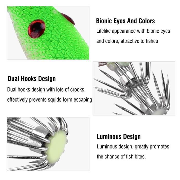 Crochets De Pêche - ATYHAO - YH004 - Hameçons De Tête - Double Parapluie - Pour Adultes Description :Le crochet est fabriqué dans un matériau de qualité, respectueux de l'environnement et durable pour une utilisation à long terme. Spécifications :Condition : 100 % tout neufType d'article : Hameçon de pêcheMatériau : silicone Taille : env. Caractéristiques du produit Techniques de pêche Leurre de pêche, Pêche en mer Espèces cibles Pieuvre, Calmar Nombre d'articles 1 Matériel Acier inoxydable Type Crochet de calmar Position Pêche en bateau maritime, Pêche en eau salée Numéro de Type SJ-011 Marque nom Shinlon Caractéristique Durable Application Pêche au gros hauturier OEM & ODM Acceptable Qualité Haut Haut... Fabriqué avec des matériaux de qualité, robuste et durable à utiliser. · Aspect réaliste avec des yeux et des couleurs, attrayant pour les poissons. · La... Conception lumineuse, favorise grandement le risque de morsures de poisson. Appâts de Pêche Lumineux en Forme de Crevette avec Crochet Appât Crochets LED Artificiel Facile à utiliser et pratique pour le transport et le stockage. Fabriqué avec des matériaux de qualité, robuste et durable à utiliser. 23 * 2cm/9,1 * 0,8 poucesCouleur : rose, orange, bleu, vert, jaune (un pour chaque couleur)Poids : env. Taille: 4.5 cm Crochets: hameçon triple. Un article si merveilleux, pour les amateurs de pêche, ramenez-le simplement à la maison !, Caractéristiques :1., Fabriqué avec des matériaux de qualité, robustes et durables à utiliser., 2., Aspect réaliste avec des yeux et des couleurs, attrayant pour les poissons., 3., La conception à double crochet avec beaucoup d'escrocs empêche efficacement les calmars de s'échapper., 4., Design lumineux, favorise grandement le risque de morsures de poisson., 5., Facile à utiliser et pratique pour le transport et le stockage., 6., Bon accessoire pour les amateurs de pêche, en particulier pour les calmars de pêche.