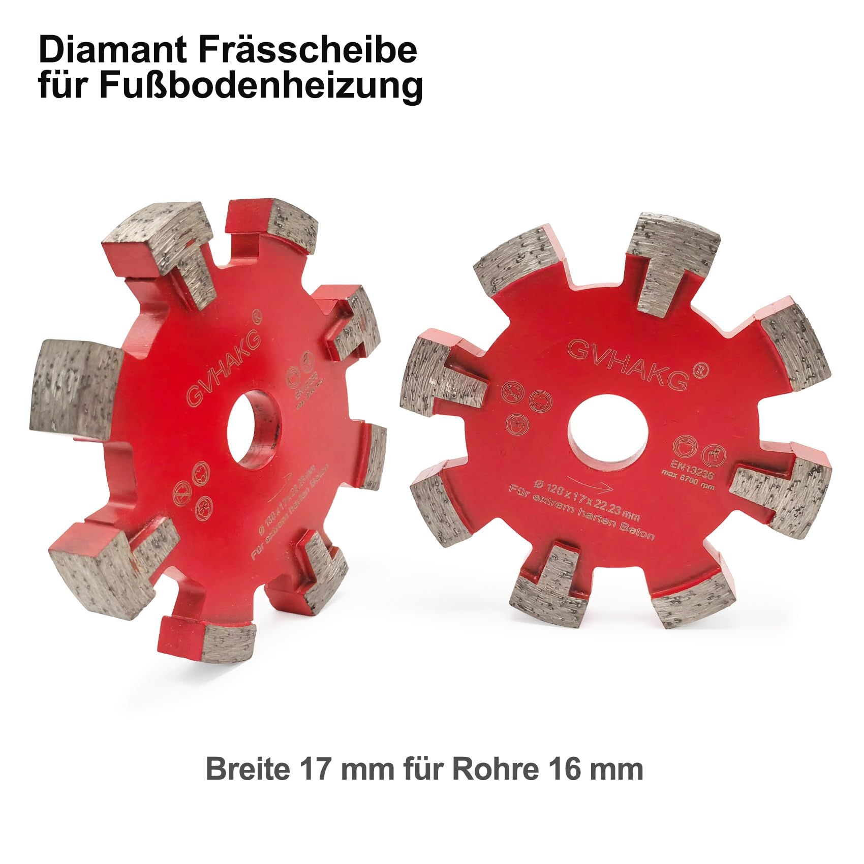 Largeur de segment : 17 mm., Nombre de segments : 8., Alésage : 22,23 mm Matériau de la lame : segment diamant + acier haute résistance Méthode de coupe : coupe à sec et humide. Veuillez confirmer les mandrins des outils de travail avant d'utiliser la lame diamantée. 4★ Applications : disque de fraisage pour sols durs, sols en béton très durs, chape de ciment, asphalte coulé, chape d'anbydrite et bien plus encore. Une machine adaptée au disque de débrayage est par exemple : fraise à sol hemming HE 120 ou fraise à sol Adamas VFX-12 Disque de fraisage diamanté de 130 mm pour chauffage au sol, sols en béton très durs et enlèvement Diamètre extérieur (mm) : 130 mm. Hauteur de segment : 10 mm., Nombre de segments : 8 Les lames de scie à fente pour chauffage au sol sont spécialement conçues et fabriquées à partir de matériaux de haute qualité. Segments de haute qualité fabriqués en diamants de haute qualité, ce qui rend le disque adapté au aisage léger de surfaces dures telles que l'asphalte de mastic, le béton, le ciment Mortier, mortier d... Joints larges : la rainure élargie en forme de U peut mieux enlever la saleté et la poussière. Les disques de fraisage au sol ont une largeur de 17 mm (pour un tube de chauffage au sol de 16 mm, c'est la norme) Largeur de segment : 17 mm., Alésage : 22,23 mm. 5 ★ Le choix – Votre nouveau chauffage au sol : conversion rapide et économique, chaleur agréable et efficace grâce au fraisage dans des sols en béton très durs. GÖLZ - Disque diamant fraise 2 pièce pour scies à sol - coupe à eau - ø 280 mm GVHAKG Disque De Fraisage Diamanté 120 Mm, 17 Mm - 8 Segments - Rainure En Forme De U Ne maintenez pas le disque de fraisage diamant plié lors de la coupe.