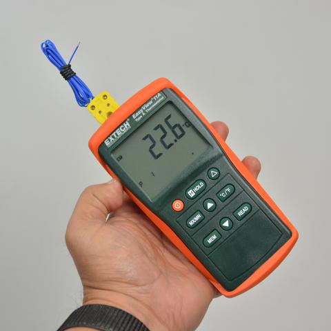 Ce thermomètre portable a une plage de températures (type K) de -50 à 1 300 °C (-58 à 1 999 °F). Comprend un écran LCD à double affichage, enregistre/rappelle... L’EA11A est un thermomètre à entrée unique de type K Easyview. Il comporte un double écran LCD, les fonctions de mémorisation et rappel manuels de jusqu’à 150 lectures et de mode des valeurs minimales/maximales/moyennes. 407730 Manual Thermometre Numérique 2 Entrées Type K - EA10 - EXTECH Easyview Ea11a Manual Cet appareil peut vous permettre de prendre différents types de mesure en changeant simplement la sonde. Mémorisation et rappel manuels de 150 lectures. Le modèle EA11A est un thermomètre à entrée unique de type K EasyView. Ce thermomètre portable a une plage de températures (type K) de -50 à 1 300 °C (-58 à 1 999 °F). Comprend un écran LCD à double affichage, enregistre/rappelle manuellement jusqu'à 150 mesures et les fonctions Mode Min/Max/Moyenne. Fourni avec 6 piles AAA, une sonde métallique polyvalente de type K et un... EXTECH Termómetro De Termopar , Conector De Sonda Tipo Miniatura Numero De Entradas 1 Termopar Tipo K Présente un design compact et robuste doté d’un grand écran LCD à contraste élevé. Livré avec 6 piles de type AAA, deux sondes filaires et un étui. D'autres sondes sont disponibles. Ce thermomètre portatif dispose d’une gamme de températures (Type K) de - 58 à 1 999 °F (- 50 à 1 300 °C).