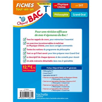 LES FICHES Des fiches détachables au format poche pour une révision efficace ! AVEC des cartes Revis'Express pour valider rapidement ses connaissances ! Fiches Bac SVT Tle S Obligatoire et Spécialité - - Jean-Claude Hervé Fiches Bac Français Prépabac - SES 1re Générale (spécialité Fiche Bac Svt 2025 Description de l'éditeur Les méthodes clés pour préparer les épreuves. Inclus : 10 vidéos immédiatement accessibles via un QR codeDes vidéos de révision pour mémoriser des notions clés du programme Gratuit, avec l’achat du livre : un abonnement au site de révision www.annabac. ANNALES Des sujets types corrigés pour préparer et réussir son BAC ! Découvrez nos autres collections pour aller plus loin : REUSSIR AVEC NOS EXPERTS Nos experts vous donnent les clés pour réussir vos épreuves du BAC. De 200 à 350 exercices d'entraînement et leurs corrigés détaillés. OBJECTIF BAC FICHES Tout-en-un Tle Spécialités Physique-chimie et SVT Philo - EUR 7,42. À VENDRE! Objectif BAC Fiches Tout-en-un Tle Spécialités Physique-chimie et SVT Philo Grand oral. Il peut s'agir d'un exemplaire défectueux en bon état. Des annotations peuvent être présentes dans le texte. ✅ Geprüfte Gebrauchtware ✅ Verkäufer seit 2015 ✅ Käuferschutz Cinéma Musique Livres Manuels scolaires Livres audio Livres anciens Objectif 306286991172 Spécial Bac Fiches SVT Tle Bac 2024 Tout le programme en 59 fiches... Tout le programme de l’épreuve écrite du bac en 12 chapitresChaque chapitre comprend :1.un test d’évaluation pour faire le point sur ses connaissances2.des fiches de cours et de méthode3.une carte mentale récapitulative4.des sujets de bac de différents niveaux (« Objectif bac »/« Objectif mention »)5.des corrigés détaillés et commentés Une préparation au Grand Oral • Des conseils pour choisir votre question en SVT• Les méthodes pour construire l’exposé et réussir la soutenance le jour J• Une simulation d’oral sur une question issue du programme de SVT. Trouvez dans chaque ouvrage : Les cours complets réexpliqués dans chaque matière.