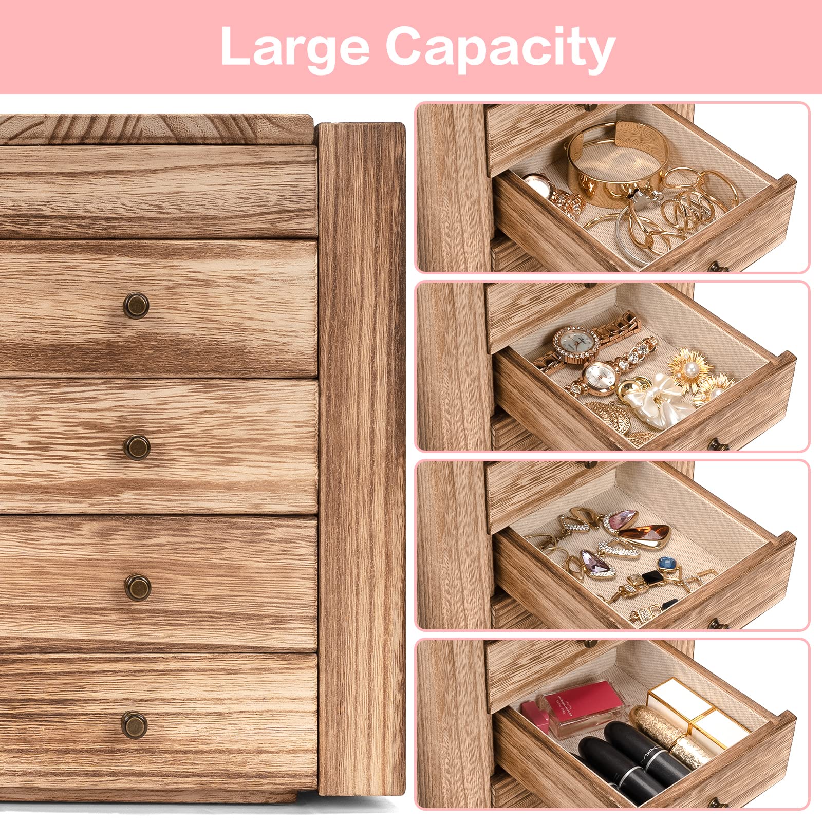 Cadeau idéal pour un être cher : la maman, épouse, fille ou petite amie, la boîte à bijoux est également parfaite comme cadeau de pendaison de crémaillère et cadeau d'anniversaire, nous pouvons être sûrs que ce sera le cadeau le plus pratique et mémorable qu'ils aient jamais reçu Coiffeuse Avec Miroir Et 4 Tiroirs,coiffeuse Avec Tabouret,table De Tiroir organisateur bijoux Quatre tiroirs coulissants empêchent vos bijoux de se salir ; stockez facilement différentes tailles de bijoux, même des colliers, des bracelets et des grandes boucles d'oreilles comme des boucles d'oreilles créoles. Description du produit Grande boîte à bijoux rustique en bois pour elle Avez-vous déjà pensé à un cadeau délicat et pratique pour elle ? Alors vous devez envisager cette boîte à bijoux en bois unique Le matériau en bois rustique avec finition torchée lui donne une sensation classique. Couleur. Noir carbonisé. · Marque. Emfogo · Matériau. Verre Bois · Style. Rustique · Fonctionnalité spéciale. Réglable, anti-poussière, miroir, amovible Économisez de l'espace : la taille de la boîte de rangement de bijoux : 21 cm (L) x 16 cm (l) x 27 cm (H). Bois massif : fabriqué en bois rustique de qualité, robuste et durable pour supporter des bijoux lourds. Grande capacité : la couche supérieure a un miroir intégré et un plateau à anneaux, 4 tiroirs coulissants empêchent vos bijoux de se salir, stockez facilement différentes tailles de bijoux, même des colliers, des bracelets et des grandes boucles d'oreilles comme des boucles d'oreilles créoles 2 portes latérales pour accrocher... Porte-collier Le métal est solide pour contenir des gros colliers, pas de déformation, avec un style vintage, il fera briller vos colliers bien-aimés. Le tissu intérieur de haute qualité protégera vos bijoux des rayures et de la poussière. Déco entrée tasseaux de bos et mror kea | Décorer entrée mason Couche supérieure Avec un miroir intégré qui vous aide à gagner un temps précieux le matin avant de partir pour une longue journée de travail. Boîte à bijoux élégante : vos collections de bijoux en pleine croissance encombrent-elles votre commode ? La boîte à bijoux est conçue avec 5 couches et 2 portes latérales. Cadeau idéal Cette boîte à bijoux, avec un grand savoir-faire et un design artistique supérieur, est sans aucun doute un merveilleux cadeau pour les femmes, les filles, et va certainement leur apporter beauté, joie et bien rangé. L'intérieur recouvert de tissu de lin protège vos bijoux contre la poussière, les rayures, les dommages. La grande boîte à bijoux en bois peut durer des années