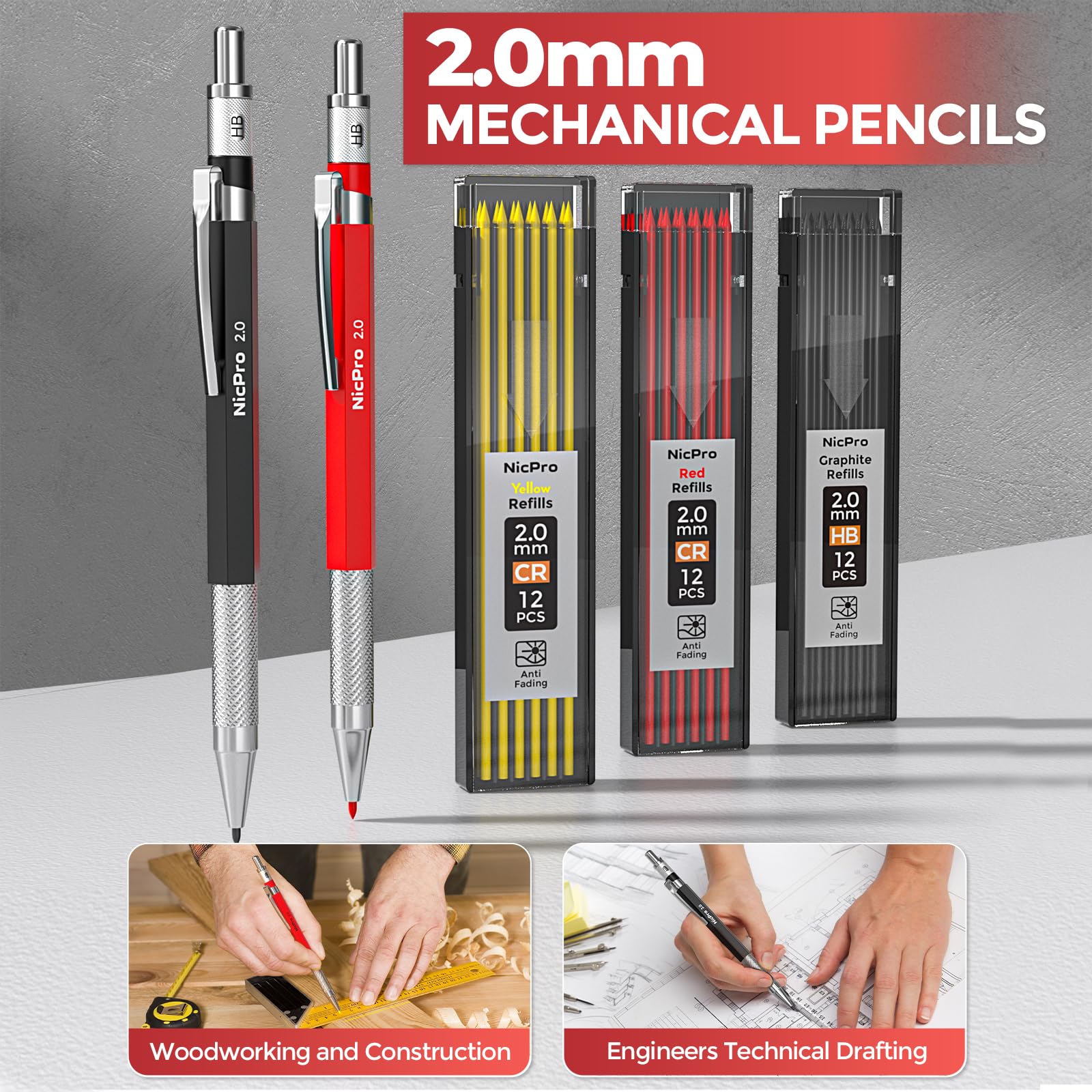 Set de crayons de charpentier : vous recevrez : 2 crayons charpentier CP3000 de 2,8 mm, 36 mines de 2,8 mm en 3 couleurs, 3 marqueurs à pointe longue en 6 couleurs, 2 porte-mines de 2,0 mm avec 48 recharges colorées de 2,0 mm, 1 outil de traçage en carbure avec 5 pointes de rechange, 1 pointeau central automatique avec 1 aiguille de rechange (remplaçable), 1 gomme 4B, 3 taille-crayons et 1 boîte en plastique. Recharge de mine de haute qualité en noir et couleurs : Ce crayon de chantier robuste est disponible en deux tailles de trait (2,0 mm et 2,8 mm) avec 84 recharges noires et colorées. Crayon marqueur pour trous profonds : Ces crayons de construction sont dotés d'une pointe allongée de 45 mm, ce qui facilite le marquage précis des trous profonds ou étroits et des interstices inaccessibles aux crayons traditionnels, réduisant ainsi le besoin d'outils supplémentaires et les manœuvres complexes. arqueur Jet -Fast de qualité supérieure [10 ines taille-crayon... Nicpro 30 PCS Porte-ines étal dans étui Cuir, Crayon écanique... Crayon Charpentier Nicpro Crayons Charpentier, Porte-Mines Avec 12 Mines Polyvalentes Taille Crayon Electrique Ce coffret complet de crayons menuisier vous permet de terminer vos travaux plus rapidement et plus facilement. Nos top 10 des Crayon De Chantier en France Elles ne se cassent pas et ne s'abîment pas facilement. 3 couleurs (noir, jaune, rouge) : pointe fibre durable pour des lignes régulières sur des matériaux difficiles à tracer avec un crayon, comme le verre, le métal et le plastique. Outils de charpentier variés : Doté d'un outil de traçage en carbure de tungstène, il permet de graver facilement sur des matériaux durs comme le métal, le carrelage, le verre, la céramique, le bois, etc.