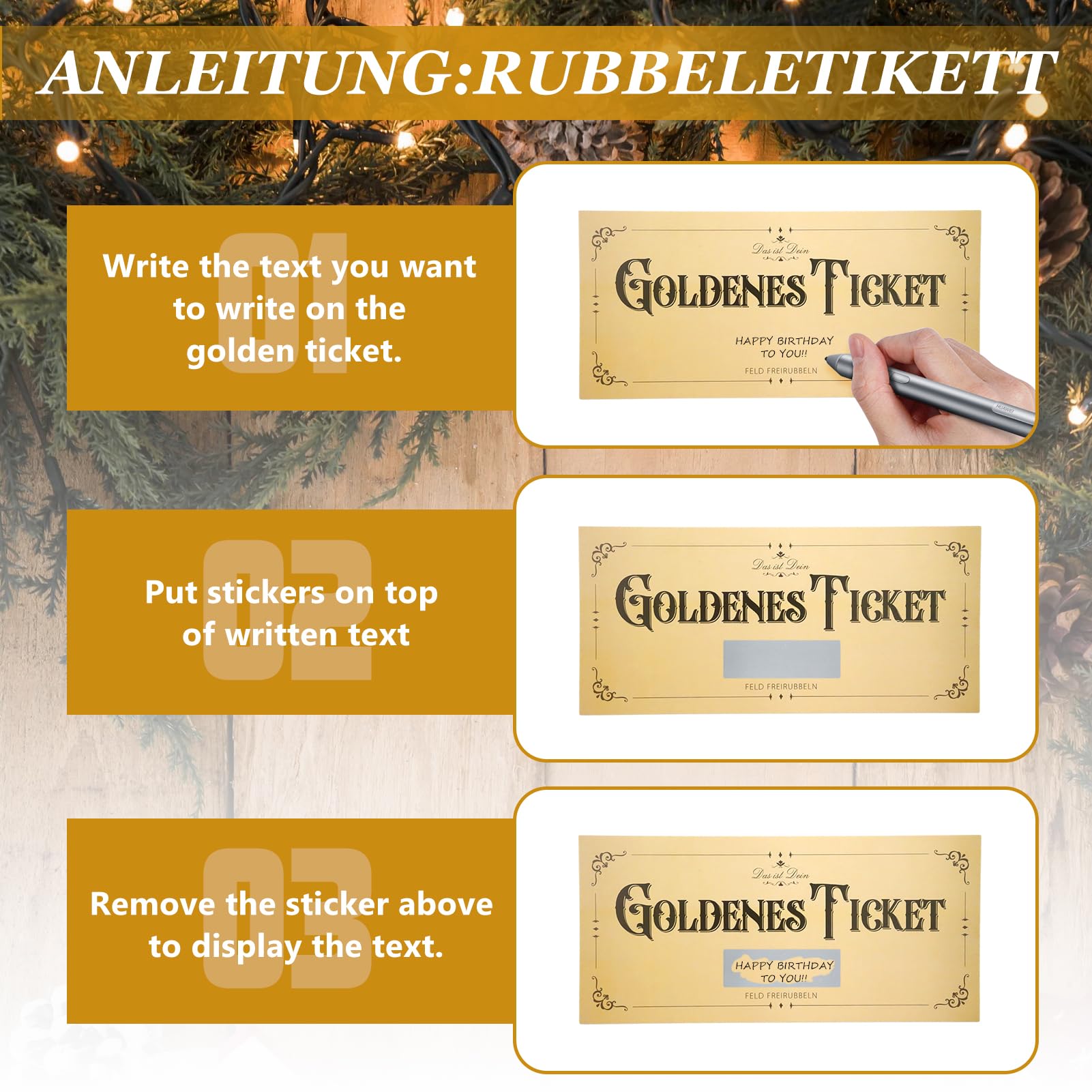 Facile à utiliser : le remplissage automatique des tickets dorés est sans effort. Imaginez que vous tenez un peu de magie dans vos mains – le lot de 3 « ticket d'or » apporte exactement cela. Faux Ticket A Gratter Lot De 3 Tickets Dorés à Remplir Soi-même Avec Autocollant à Bon Cadeau A Remplir Que ce soit comme invitation à une chasse au trésor secrète, comme souvenir d'une merveilleuse aventure ou comme porte-bonheur pour les amis et la famille, ces billets dorés enchanteront et feront sourire tous ceux qui les reçoivent. Un petit plaisir doré pour les personnes et les moments spéciaux - Parfait comme cadeau, souvenir ou pour des idées créatives. Bon personnalisé à remplir soi-même Sticker à gratter Carte à gratter à Elles sont composées Fabriqué en matériau de qualité supérieure qui scintille doucement et diffuse une sensation de chaleur et de joie, comme Winnie l'Ourson l'aime. Un bon cadeau : dans notre lot de cartes cadeaux, vous trouverez non seulement le billet vide, mais aussi une enveloppe dorée élégante et l'étiquette à gratter... Idée cadeau créative : avec un design unique des autocollants à gratter, en grattant l'autocollant, les destinataires peuvent révéler leur destination et ajouter une touche mystérieuse et excitante au cadeau. Un cadeau de qualité supérieure pour différentes occasions, conçu avec amour. L'impression est claire et inodore, et l'étiquette à gratter est plus facile à appliquer et à frotter. Accueil › · Enveloppes Et Fournitures D'expédition › · DasWas 2x Carte U00e0 Gratter Ticket D'Or - Carte Cadeau U00e0 Remplir Avec Autocollant U00e0 Gratter... Carte personnalisée pour noël ludique et chic fait main Écrivez votre texte, collez l'autocollant à gratter, insérez la carte dans l'enveloppe et surprenez vos proches. Bon surprise : le lot comprend 3 cartes cadeaux dorées, 3 autocollants à gratter et 3 enveloppes assorties.