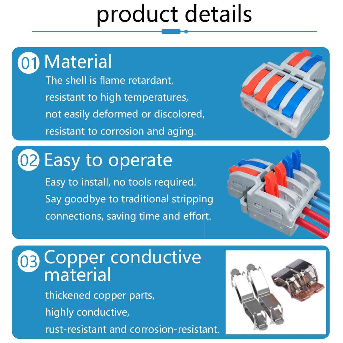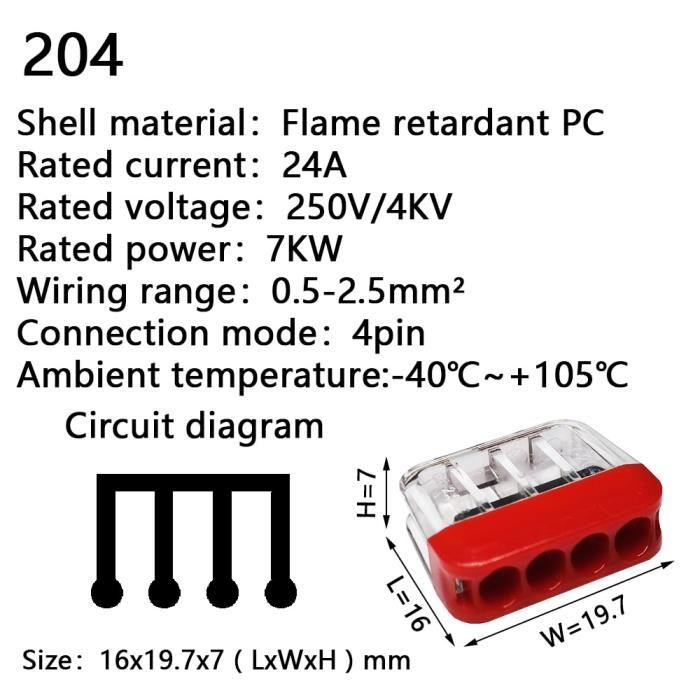 Boucle à ressort en acier inoxydable : forte élasticité, pas facile à desserrer et à tomber, et durable. Longueur de dénudage : 8-10 mm, Coque : plastique ignifuge, liste de colisage: La coque est en nylon PA66, ignifuge et résistant aux hautes températures, protège efficacement le fil chauffant et réduit les risques de sécurité. ●Instructions spéciales : chaque borne de connexion rapide peut également être réutilisée. Spécification : · Courant nominal : 41 A · Tension nominale : 450 V · Plage de câblage : 0,5-4(6) mm²/AWG 20-10 · Matériau de la pièce conductrice Borne électrique Pour Fils Rigides Cosse Electrique Connecteurs électriques, 8pièces Connecteurs De Borne électrique Pour Fils Souples ●Plage de câblage : pour les fils massifs de 0,5 à 4 mm² et les fils flexibles de 0,5 à 6 mm², la conception d'interface de haute qualité rend le câblage simple et rapide, réduisant ainsi les risques pour la sécurité. Facile à installer, aucun outil requis. La partie dénudée du câble doit être insérée dans le fond et ne peut pas être exposée à l'extérieur. Dites adieu aux connexions de dénudage traditionnelles, économisant du temps et des efforts 8 Pièces Connecteurs Électriques Rapide Avec Levier, Bornes De... 1 boîte de rangement en plastique pour un rangement et une portabilité faciles, 16 vis (3*16mm) Insérez le fil dénudé dans l'ouverture du fil Scénarios d'application : câblage extérieur, câblage électromécanique, câblage domestique, décoration, distribution électrique technique Convient à tous types de câbles Convient à différentes spécifications et modèles de câbles pour répondre à différents besoins Fils applicables : Fil entrant : 0,5-6,0 mm²/AWG20-10 Fils applicables : Sortie : 0,1-4 mm²/AWG28-10, Spécification :, Courant nominal : 41 A, Tension nominale : 450 V Aiqeer 15 Pièces KV424 Levier-Écrou Fil Connecteurs, 2 in 4 out 6 Ouvrez la poignée du booster de câblage Plage de câblage : 0,5-4(6) mm²/AWG 20-10 le trou d'entrée de câble peut insérer rapidement des câbles souples et durs, ce qui est pratique, simple et réutilisable. Dites adieu aux connexions à dénuder traditionnelles, économisant du temps et des efforts Démontage du produit et sélection des matériaux Bande de cuivre : forte conductivité, anti-broderie et résistance à la corrosion. ●Matériau : conducteur en cuivre, forte conductivité électrique ; circlip intégré en acier nickel-chrome fortement allié, serrant fermement le fil pour garantir que la connexion du fil est serrée et ne tombe pas ; la coque est ignifuge et résistante aux hautes températures, difficile à déformer et à décolorer, résistante à la corrosion et au vieillissement (remarque : ce connecteur ne peut être connecté qu'à deux électrodes différentes de l'alimentation en même temps, ne peut pas être connecté à 3 électrodes de l’alimentation en même temps., )