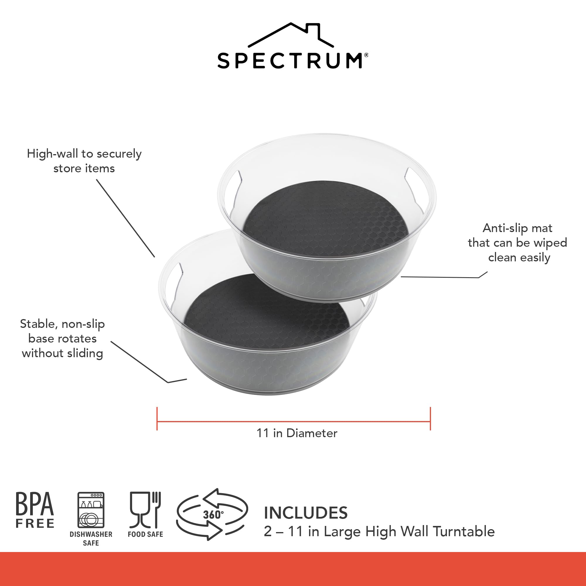 Conservez vos condiments et épices dans un endroit facile d'accès avec le lot de 2 grands Lazy Susan HEXA de Spectrum Diversified. Transport facile et accessibilité : les poignées intégrées permettent de transporter sans effort le HEXA Lazy Susan de Spectrum du réfrigérateur à la table à manger ou tout autre endroit, vous assurant d'avoir tout ce dont vous avez besoin à portée de main. Design optimisé pour plus de sécurité et d'efficacité : la suspension HEXA Lazy Susan de Spectrum dispose de côtés fermés, assurant que les articles restent en sécurité sans risque de tomber ou de se renverser. Spectrum Organiseur Hexa Lazy Susan à 2 niveaux – Plateau Dimensions (H x l x P) : 22 x 23,5 x 23,5 cm. Design durable et intelligent : fabriqué avec des matériaux de haute qualité pour résister à une utilisation... Spectrum Hexa Lazy Susan Lot De 2 Grands Plateaux De Rangement Rotatifs Avec de multiples utilisations, vous pouvez placer ce Lazy Susan dans le réfrigérateur pour faciliter l'accès aux condiments et aux sauces, le centrer sur la table avant votre prochain dîner, contenir des articles de soins capillaires et de la peau dans la salle de bain, des épices dans l'armoire, ou des huiles et vinaigres dans le garde-manger. Économe en espace et esthétique : mesurant 31,1 x 31,1 x 11,4 cm, Spectrum HEXA Lazy Susan est conçu pour optimiser l'espace tout en servant d'ajout attrayant à n'importe quel environnement, offrant à la fois fonctionnalité et style. Entretien simple : prendre soin de HEXA Lazy Susan de Spectrum est simple. Placement et application polyvalents : ce support extensible HEXA Lazy Susan de Spectrum s'adapte parfaitement à différents endroits de votre maison. Pour un look frais et propre, il suffit de le laver à la main avec du savon et de l'eau chaude.