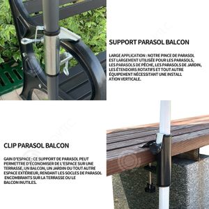 Nombreuses utilisations : ce support de parasol de terrasse peut être fixé à la plupart des balustrades, clôtures, blanchisseurs, bancs, hayons, bateaux, et plus encore, offrant une ombre instantanée et pratique. Cette fonctionnalité vous permet d'économiser de l'espace et de profiter de votre espace extérieur sans vous soucier du désordre. Caractéristiques : Nom : pince pour parasol de terrasse., Matériau : fer. Flexible et réglable : la pince de parasol est adaptée pour les poteaux de parapluie avec des diamètres allant de 1,9 à 3,8 cm. Vous pouvez l'emporter partout où vous allez. Le traitement de surface galvanisé le rend très résistant à l'oxydation, assurant qu'il ne rouille pas facilement, ce qui le rend idéal pour une utilisation en extérieur. Support de parasol pour balustrade de balcon, support de parasol pour... Caractéristiques : 1., Antirouille et durable : la pince de parapluie pour terrasse est fabriquée en acier robuste, solide pour tenir votre parapluie. Vous pouvez être sûr que cette pince de parapluie durera pendant des années. Vous pouvez régler le diamètre du trou en serrant la vis, en veillant à ce qu'il s'adapte parfaitement à votre poteau de parapluie. Attache Parasol CCYKXAA 1 PCS Support Parasol Balcon, Pince De Table Pour Parasols De Jardin, Support Pour For Sun Lounger Vous pouvez l'installer en quelques minutes, et il est prêt à l'emploi. Support De Parasol Pour Balcon NIMUDU Pied De Parasol,Pied Parasol Porte-Support De Parasol Support De Support Parasol Il est idéal pour une utilisation avec des parapluies, des drapeaux et des bâtons de pêche. Il suffit de trouver une position pour fixer le support de parapluie, de serrer les vis en bas, puis de profiter d'un moment parfait. Antirouille et durable : cette pince de parapluie pour terrasse est fabriquée en acier de haute qualité qui est robuste et assez solide pour maintenir votre parapluie en toute sécurité. Retrouvez ci-après nos 69 offres, marques, références et promotions en stock prêtes à être livrées rapidement dans nos magasins les plus proches de chez vous Le support de parasol de terrasse est très simple à installer.