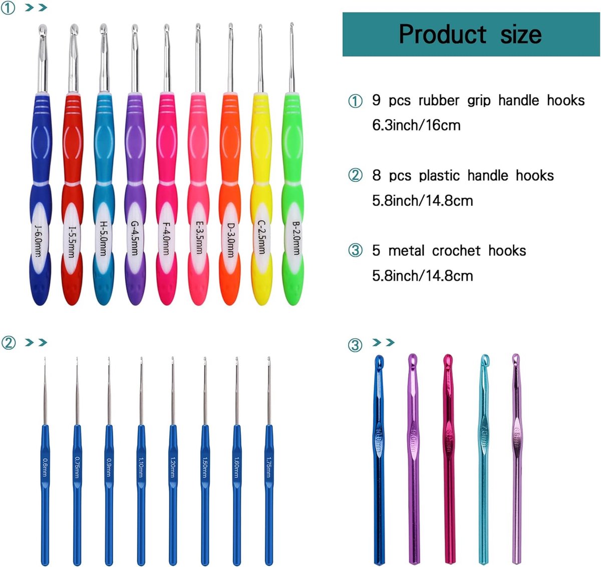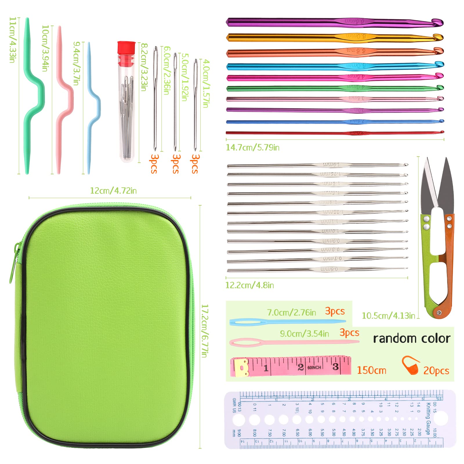 NAMOON Lot de 60 crochets livrés avec un sac de rangement. La poignée est très douce et confortable, vous pouvez tricoter pendant une longue période sans vous sentir inconfortable. 10 crochets multicolores en aluminium, la taille est de 2 mm à 6,5 mm, 12 aiguilles à tricoter en acier inoxydable, la taille est de 0,6 mm à 1,9 mm. Débutants en crochet ? Ce kit de 60 pièces a tout ce qu'il vous faut ! Il comprend 22 crochets en aluminium (tailles 2mm à 6,5mm 12 aiguilles fines 0,6mm... Kit De Crochet Pour Débutant Adulte, 58PCS Crochet Et Aiguille à Tricoter Ergonomique, Aiguilles à Crochet Set Avec Pelotes De Laine - Beaux-Arts Et Loisirs... Matériel Tricot Et Crochet Lot De 56 Aiguilles à Crochet Avec étui De Rangement Pour La Maison Aiguilles Et Crochets Ensemble complet de crochet lisse : le crochet glisse facilement et évite d'accrocher les fils de séparation, ce crochet en aluminium poli est parfaitement formé pour un crochet lisse. Kit De Crochet Pour Débutant Adulte, 58PCS Crochet Et Aiguille à Facile à ranger et à transporter : nous avons préparé un sac de rangement pour votre kit de crochet. Un ensemble complet de crochets peut répondre à vos différents besoins en crochet. Ces crochets sont livrés en deux rangées et sont livrés dans une pochette en cuir violet pour un transport ou un rangement faciles, et peuvent être retirés pour le rangement sans la pochette à tricoter.