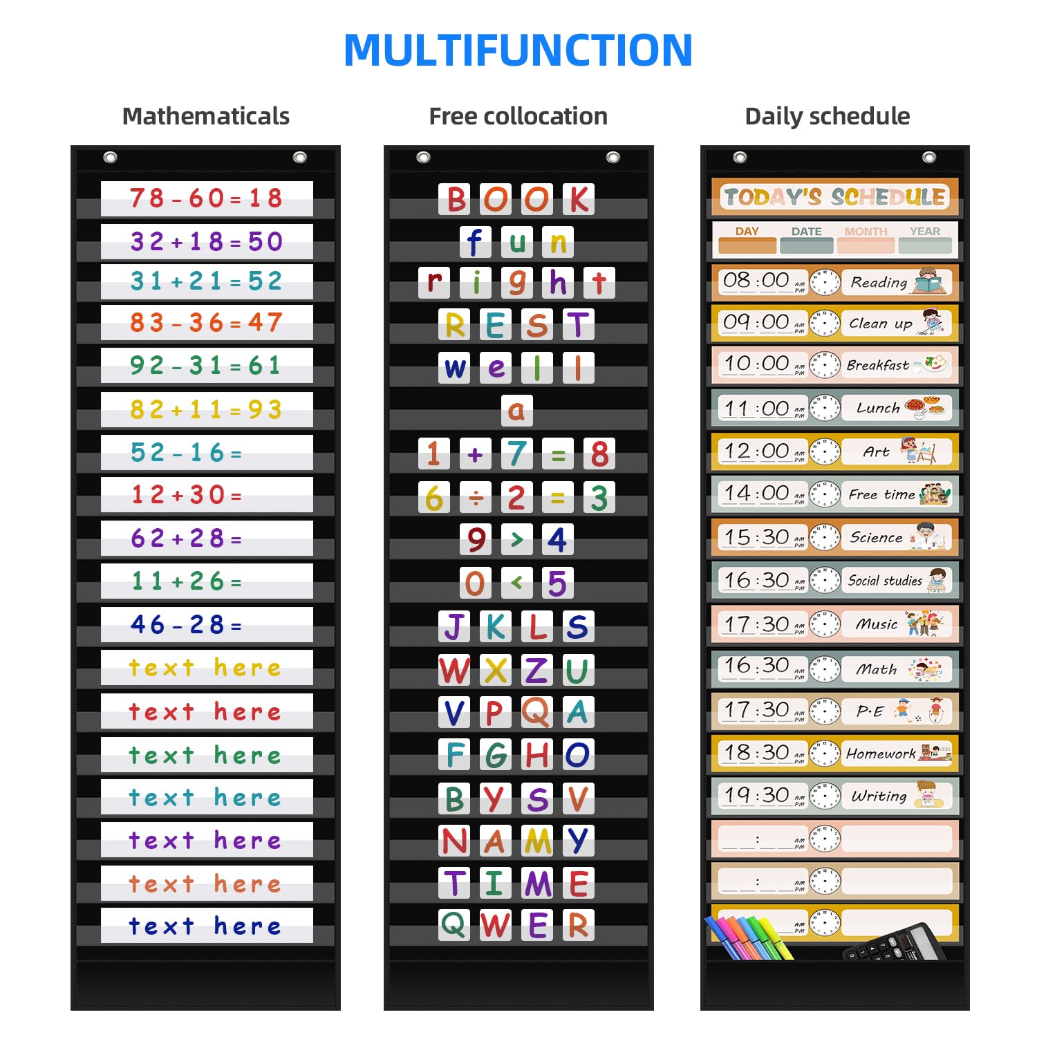 C'est bon pour les enseignants et les parents pour planifier et garder les commandes, renforcer le sens du temps des enfants et des enfants d'âge préscolaire. Le tableau de poche ANSTROUTBohoDaily School est très utile pour les enseignants et les parents pour planifier et garder les commandes, renforcer le sens du temps des enfants et des enfants d'âge préscolaire. Au-delà de la polyvalence ! Utilisez les 4 tableaux seuls ou connectez-les verticalement ou horizontalement avec des attaches auto-agrippantes pour créer un tableau plus grand. S'accroche avec des aimants ou des œillets sur n'importe quelle surface magnétique ou porte-cartes Utilisez-le pour jouer à des jeux avec les enfants, rendre vos leçons plus intéressantes, améliorer le plaisir des enfants. Caractéristiques du produit : Couleur : noir. ※【Facile à accrocher】Il y a 2 crochets adhésifs et 2 crochets de porte pour ce tableau de poche, facile à accrocher au mur ou à la porte, ce qui vous permet d'économiser de l'espace pour rendre votre vie plus intéressante. Matériau du produit : Tissu principal : nylon noir 420D., Poche : PVC transparent. Autocollants Halloween, Double Face Réutilisables Halloween Stickers, Sorcière Citrouille Chat Contenu : 1 tableau de poche bohème quotidien avec 18 + 1 poches, 30 cartes réutilisables double face au total, 2 crochets adhésifs, 2 crochets de porte. Rendez l'enseignement en classe et à la maison divertissant. ※【Grande taille et plus de poches】Notre tableau de poche bohème mesure 117 cm de haut x 33 cm de long, ce qui augmente la taille permet d'avoir plus de poches dans le programme d'enseignement. ANSTROUT Tableau De Poche Avec 96 Cartes, Tableau Des Emplois Tableau présentoir 81 x 105 cm, avec 12 poches 25 x 19 cm et 5 œillets d'accroche. En polyester et couture double pour une meilleure résistance. Lavable à la main, séchage à plat. Idéal pour y glisser des fiches plastifiées d'activités (les mois de l'année...), les photos des enfants d'un groupe... Les 18 poches sont en PVC respectueux de l'environnement et transparent, et le fond du sac de rangement est fabriqué à partir de tissu en nylon durable pour organiser les cartes. Contenu de l'emballage : 1 tableau de poche noir avec 18 + 1 poches.