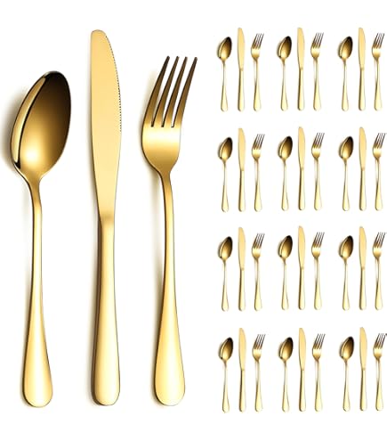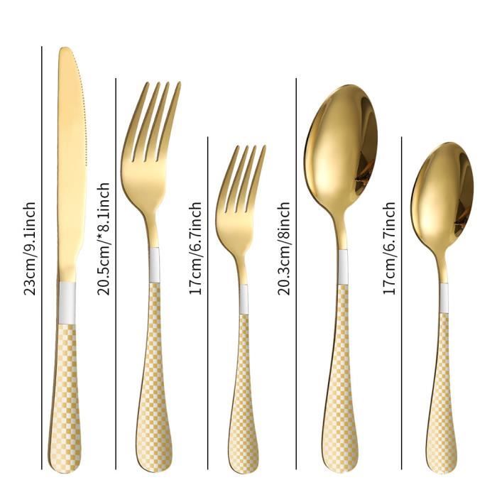 Style élégant : design simple avec des lignes épurées et intemporelles. Bysta Lot de 20 couverts dorés pour 4 pièces en acier inoxydable raffiné de haute qualité. Couverts De Table, Lot De 36 Couverts En Acier Inoxydable Avec Couteaux À Steak, Set De Couverts Les bords mats ne vous blesseront pas la bouche, le couteau dentelé tranchant vous aide à couper les aliments facilement. Caractéristiques du produit Qualité : acier inoxydable 18/0 de qualité supérieure, antirouille. Passe au lave-vaisselle : cet ensemble de couverts passe au lave-vaisselle, ce qui rend le nettoyage facile et pratique, vos soins appropriés peuvent garder les ustensiles comme neufs et leur permettre de durer pendant de nombreuses années. Aspect simple et propre, sans décoration ennuyeuse pour correspondre à n'importe quel style de vos ustensiles de cuisine. Ensemble d'argenterie en or de 20 pièces pour 4, | Ubuy Matériau de haute qualité : fabriqué en acier inoxydable de haute qualité, excellente résistance à la corrosion, extrêmement durable. Fonctionnel : la vaisselle saine et pratique apportera plus de joie à votre salle à manger. Robuste : durable et pas besoin de vous soucier de plier. Ebern Desgns Ensemble de couverts en acer noxydable Ebap Desgns... Une bonne qualité à prix abordable. Assurez-vous que vos couverts sont complètement secs avant de les conserver., 2., Ne laissez pas vos couverts dans l'eau pendant une longue période, car le trempage peut endommager définitivement le métal., 3., Si vous mettez les couverts dans le lave-vaisselle, gardez le détergent au minimum, retirez les couverts du lave-vaisselle après le cycle sec, puis séchez complètement avec une serviette douce., 4., Utilisez un détergent doux si vous lavez vos couverts à la main. Confortable : bords lisses et poignées ergonomiques.