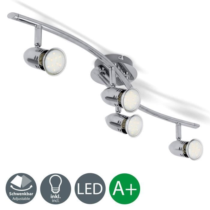 Plafonniers - GU10 : Luminaires Et Éclairage lumière blanche chaude de 3000 Kelvin indice de protection IP20 Le plafonnier à LED crée une belle atmosphère dans votre maison. Spot Plafond B.K.Licht Plafonnier LED Éclairage De Salon LED Lampe à 4 Platines LED Led Chambre ECLAIRAGE - les 4 ampoules LED fournies au culot GU10 et d'une puissance de 3 Watt chacune offrent une très agréable lumière blanche chaude et une intensité lumineuse de 250 Lumen par ampoule pour un éclairage chaleureux de 3000 Kelvin de vos pièces à vivre. ECONOMIQUE - la technologie LED vous assure des économies d'énergie jusqu'à 80% par rapport à des ampoules conventionnelles et une durée de vie exceptionnelle de 20., 000 heures. 3 des 4 spots sont pivotants et orientables pour un éclairage personnalisé. Couleurs parfaitement fidèles Répartition uniforme de la lumière B.K.Licht plafonnier LED 4 spots pivotants & orientables, 4 ampoules LED 3W GU10, barre spots plafond salon salle à manger cuisine couloir, 2 bras tournants, lumière blanche chaude ORIENTABLE - les 4 spots deplafonnier LED en métal finition nickel matte peuvent être orientés individuellement ainsi que les deux bras du luminaire afin de permettre un éclairage sur mesure de votre espace... dimensions - 25 x 25 x 9 cm