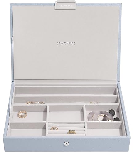 De plus, vous pouvez facilement ajouter une autre couche de boîte à bijoux au fur et à mesure que votre collection grandit. Rangez votre collection avec une boîte à bijoux Stackers. Créez votre propre boîte à bijoux adaptée à votre collection Le lot de 4 classiques est parfait pour ceux qui ont une plus grande collection et comprend le couvercle de la boîte à bijoux, la couche de bijoux, la couche de bague et le bracelet et la couche de montres/accessoires. La gamme s'étend maintenant des organisateurs de bijoux et... Stackers boîte à bijoux de voyage lisse pour colliers en rose pâle... Boite à Bijoux Stackers Stackers Bou00eete U00e0 Bijoux Classique Lavande Taille Moyenne - Lot De 3 Violet 4923bcb8 C2f2 568a 9a7d 4de5b3194866 Catalogue Stackers Le lot de 4 classiques est parfait pour ceux qui ont une plus grande collection et comprend le couvercle de la boîte à bijoux, la couche de bijoux, la couche de bague et le bracelet et la couche de montres/accessoires. Boite De Rangement Stackers Boîte à Bijoux Voyage - Vert Sauge - Velours Doux - Organisation Parfaite Organisation Bijoux Bleu foncé avec doublure en velours gris. À mesure que votre collection de bijoux augmente, votre boîte à bijoux grandit aussi Comprend un couvercle, une section pour les breloques, une section pour les bagues et les bracelets, et une section pour les montres et les accessoires