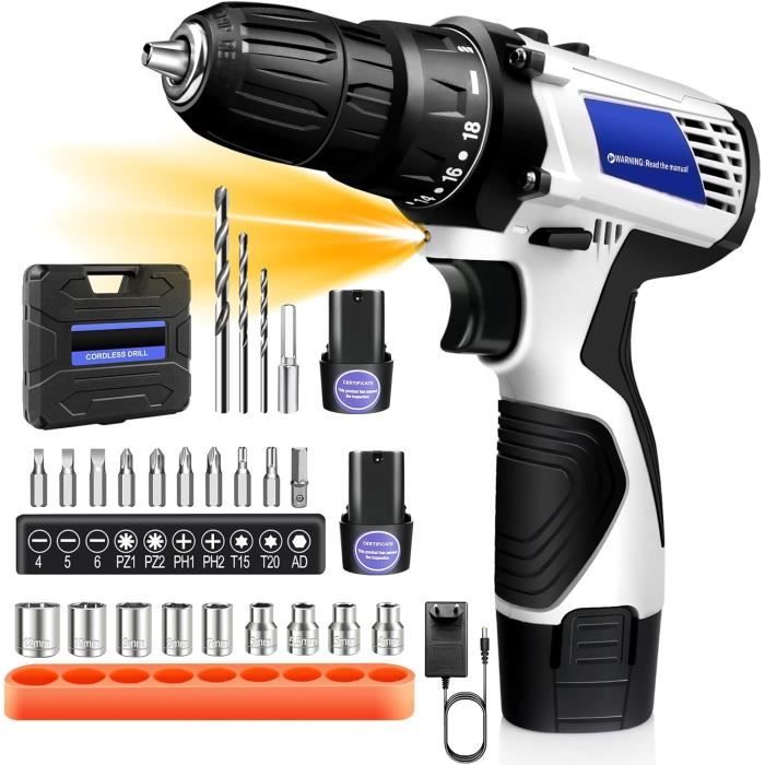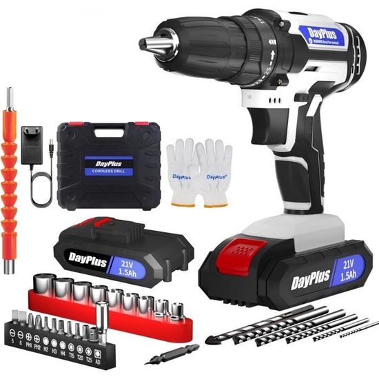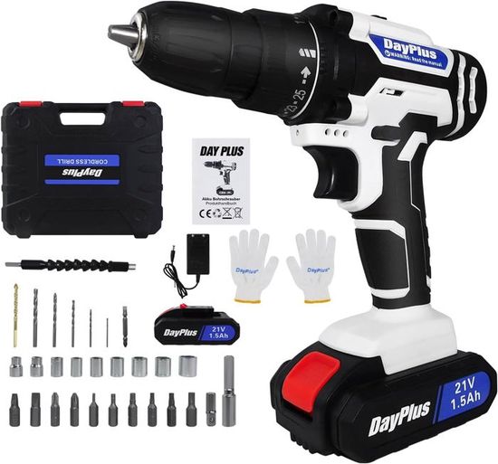 Convient pour le perçage et d'autres travaux sur des matériaux souples. Vous offre plus de confort. Perceuse Visseuse 21v Sans Fil Vickyhome 21v 45nm Perceuse - Kit Avec Batterie 1500mAh Et Accessoires Perceuse Batterie Li-ion 1500mAh Visseuse Sans Fil Accessoires multiples : kit de visseuse sans fil pour effectuer des tâches quotidiennes, et une mallette stable maintient la perceuse et tous les accessoires bien organisés, parfait pour les débutants et les artisans expérimentés. m et le réglage du couple de 25 + 1 vous permet de travailler avec précision. Vous pouvez choisir différentes vitesses de foret pour différentes situations. Couple maximal de 45 N. Si vous avez des questions, veuillez nous contacter et nous répondrons rapidement et résoudrons le problème 2 réglages de vitesse : la visseuse sans fil peut être réglée sur 2 plages de vitesse différentes, la faible vitesse (0-400 tr/min) est un couple plus élevé, convient pour percer ou visser sur certains matériaux durs. Achetez maintenant chez VEVOR. Perceuse-visseuse sans fil TEENO avec 2 batteries 1,5Ah Perceuse-visseuse à batterie, perceuse visseuse de 21 V avec batterie de 2000 mAh, perceuse sans fil max 30 N·m, réglage de couple 25 3, 2 vitesses... 1 batterie de 2000 mAh : ce kit de visseuse sans fil est équipé de 1 batterie lithium-ion de 2000 mAh, chaque batterie entièrement chargée peut être utilisée pendant 1,5 h, un chargeur rapide est inclus dans le kit. m et réglage du couple de 25 + 1 - La perceuse-visseuse sans fil Conentool 21 V offre un couple maximal de 45 N. La lumière LED intégrée vous permet de travailler dans l'obscurité. Ainsi, la visseuse sans fil peut facilement répondre à une large gamme de besoins pour percer et visser dans le bois, le plastique, le métal ou d'autres matériaux. Conception Ergonomique] La perceuse électrique est légère et compacte, ce qui la rend pratiquement sans effort à utiliser. La poignée en caoutchouc de conception ergonomique assure une prise en main confortable pendant une utilisation prolongée, évitant ainsi la fatigue des mains