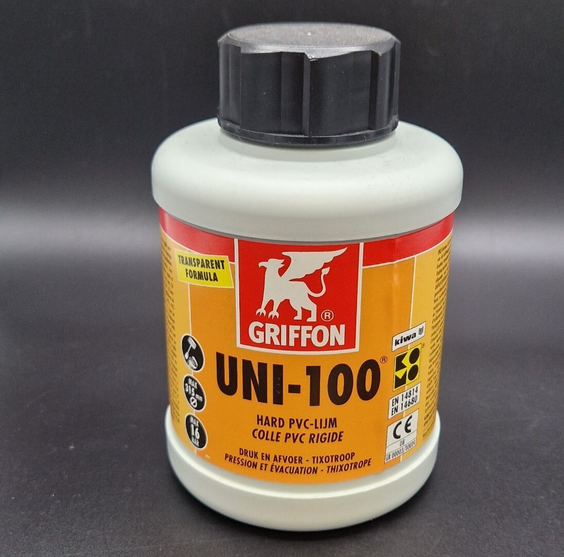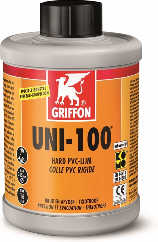 Tuyau d'arrosage,Raccords pour tuyaux en PVC PVC, 20-110mm, 2 pièces Applications : Eau, gaz, processus chimiques Industrie, traitement de l'eau piscine, technique, industrie aux installations sanitaires, installations d'arrosage, piscine, étang Oracal ittings : jusqu'à 160 mm – PN 16 à 20 °, PN 10 à 40 Filetage fittings : PN10 à 20 °, 40 ° 43,96 PN 6 & # x20ac ;/L Griffon Colle pour PVC - type Uni-100 - Colle Thixotrope PVC Rigide... Gel Pot De Colle Griffon K13523-001 UNI-100 Colle Pour Tuyaux En PVC, Rouge Griffon K13523 002 SPÉCIFICATION: Pour tuyaux de pression et drains Convient aux systèmes de tuyauterie selon EN1329, 1452, 1453, 1455 et ISO15493 (PVC) Convient aux diamètres ≤ 400 mm Max. 16 bars (PN 16) Conservez la colle à des températures de 5°C à 25°C. Telecharger des fichiers Catalogue, p.349.pdf prodlist_griffon uni 100_cz Taille : 250 ml avec brosse