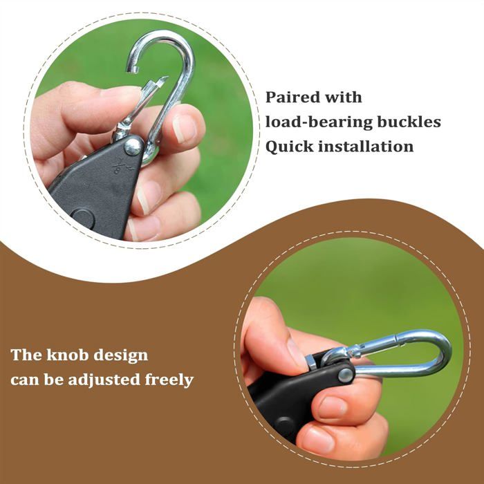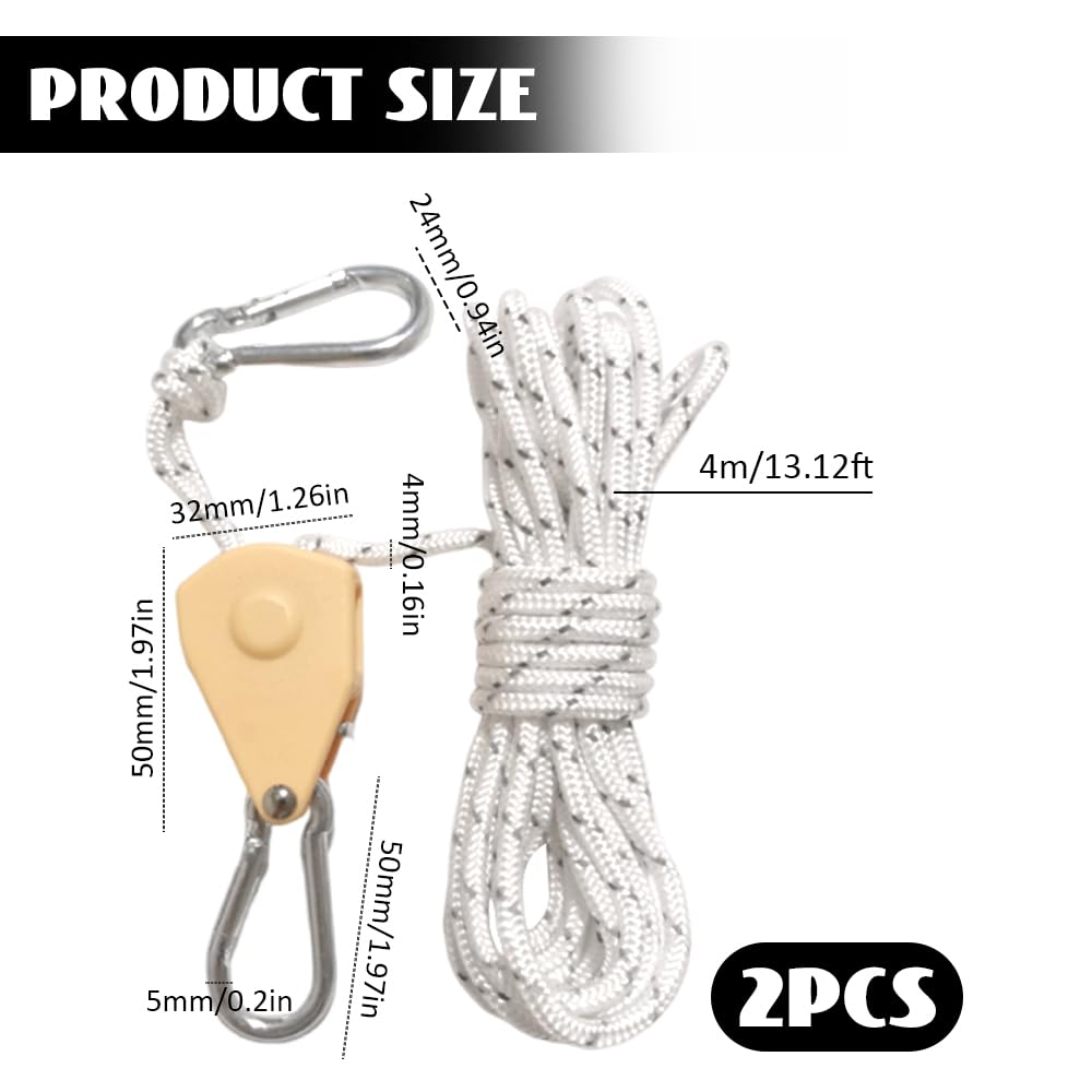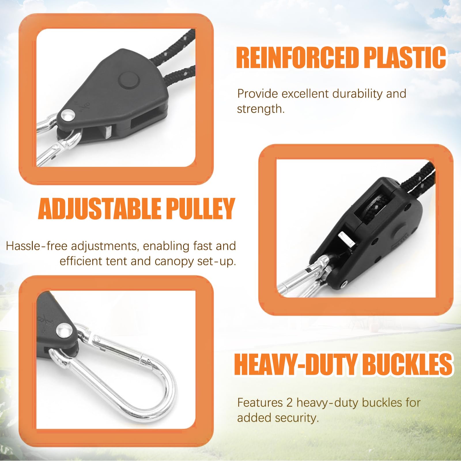 Les cordes à vent peuvent être utilisées pour le camping, les loisirs, les voyages, le sauvetage et l'aide en cas de catastrophe. Matériaux de qualité supérieure La corde de tente de camping coupe-vent est fabriquée en nylon, solide et durable, avec une force de traction élevée et une fonction haute tension et un coefficient de sécurité élevé. La poulie avec frein à corde permet un réglage précis et maintient la tension de manière fiable. Hejo 6 Pièces Corde à Cliquet, 1/8 Rétractable à Cliquet avec Crochet, 2.4m* 4mm Tendeur à Cliquet Cordede, Poulie à Cliquet Convient pour Lampe de Culture pour Ventilateur de Plantes, Lumière, Camping Description du produit Lorsque vous faites du camping en plein air, vous pouvez installer votre tente en toute sécurité à l'aide d'une corde fixe et profiter du temps avec votre famille et vos amis La poulie avec frein à corde assure un mouvement de charge contrôlé et sûr. Lot de 4 cordes de haubanage réfléchissantes réglables à cliquet 13ft/4 m avec tendeur de câble, corde à cliquet avec crochet 4 mm, tendeurs, corde de... Que vous ayez besoin d'installer votre tente, de fixer vos bagages en toute sécurité ou de soulever une petite charge, le tendeur de câble avec poulie est un outil indispensable. Le tendeur de câble est idéal pour les activités de plein air telles que le camping, la randonnée ou les tentes, mais aussi pour une utilisation dans les ateliers ou les projets de bricolage. Le cliquet assure une fixation sûre et fiable du tendeur. La poulie est compacte et légère, ce qui la rend idéale pour les déplacements. Les corde tente camping d'ombrage mesurent 4 mètres/13,12 pieds de long et ont un diamètre de 4 millimètres/0,12 pouce. La conception réglable des poulies à cliquet facilite l'installation et le démontage 4 Pièces Cordes à Cliquet, 2 Mètres Corde Cliquet Corde à Matériaux de qualité supérieure La longueur de la corde peut être ajustée en fonction de la situation réelle avec la poulie, facile et rapide à desserrer ou à serrer